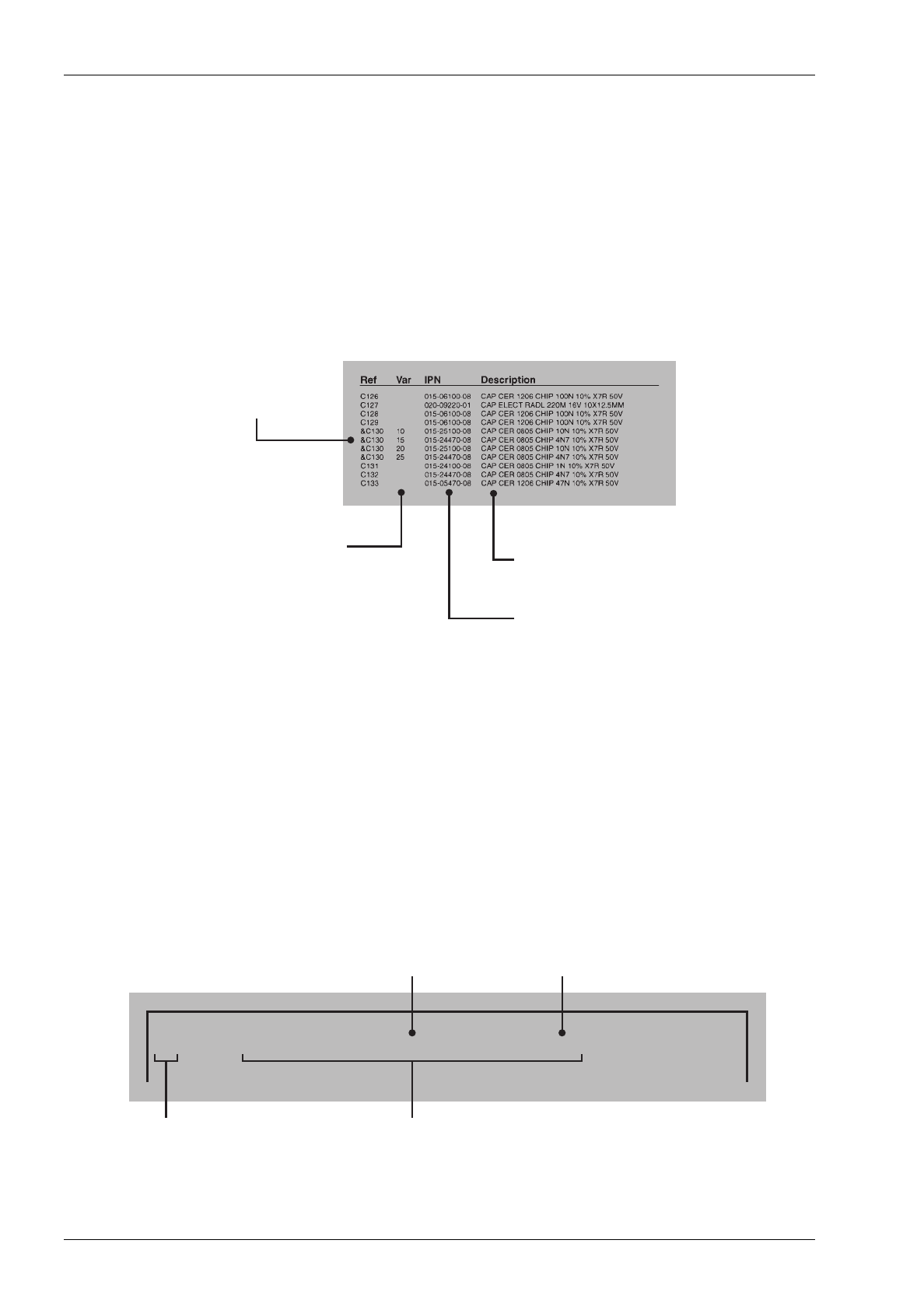 describe components unplaced in one product. Variant components have a character prefix, such as
