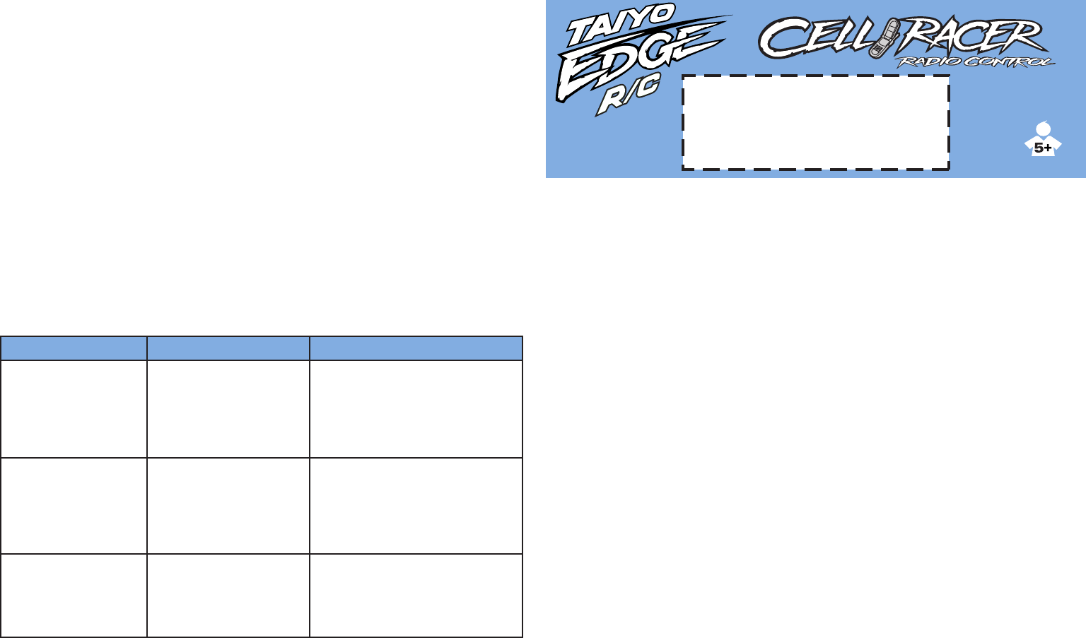 Pending.Taiyo Edge; Get the Edge!; On Road, Off-Road, No Road!; and Cell Racer are licensed trademarks of Tilbor Marketing and