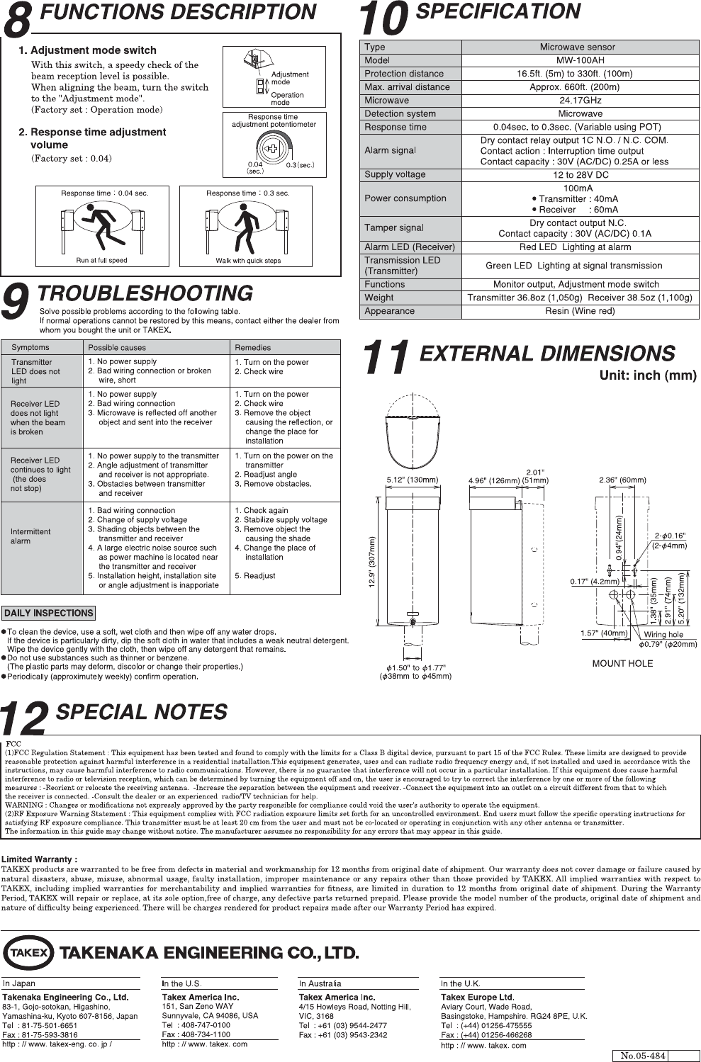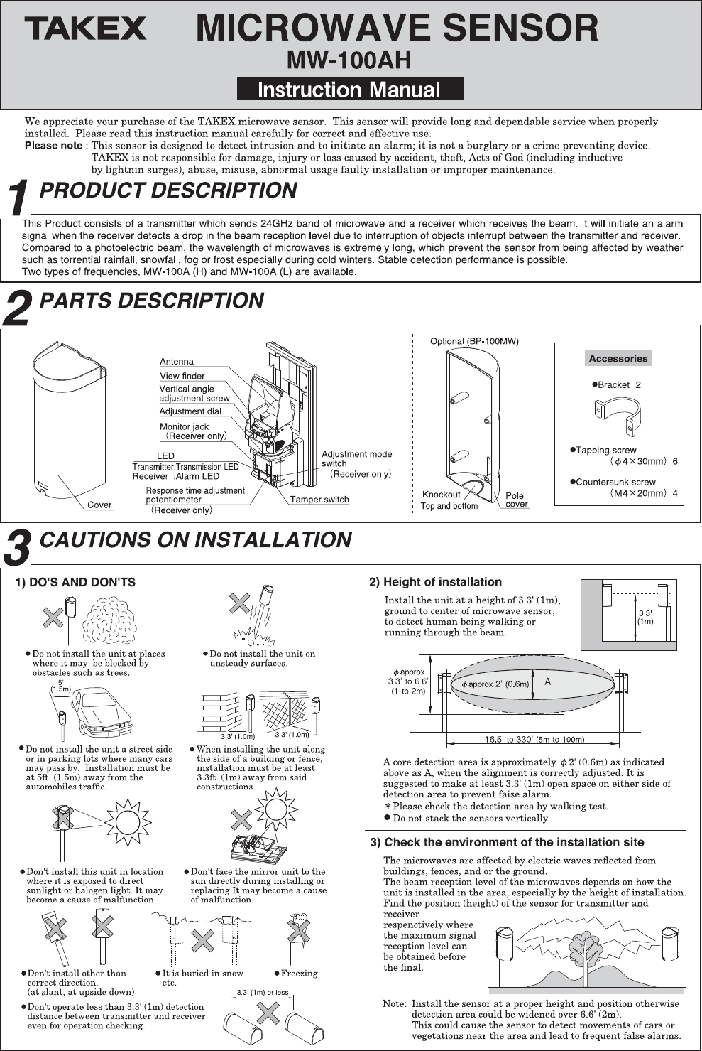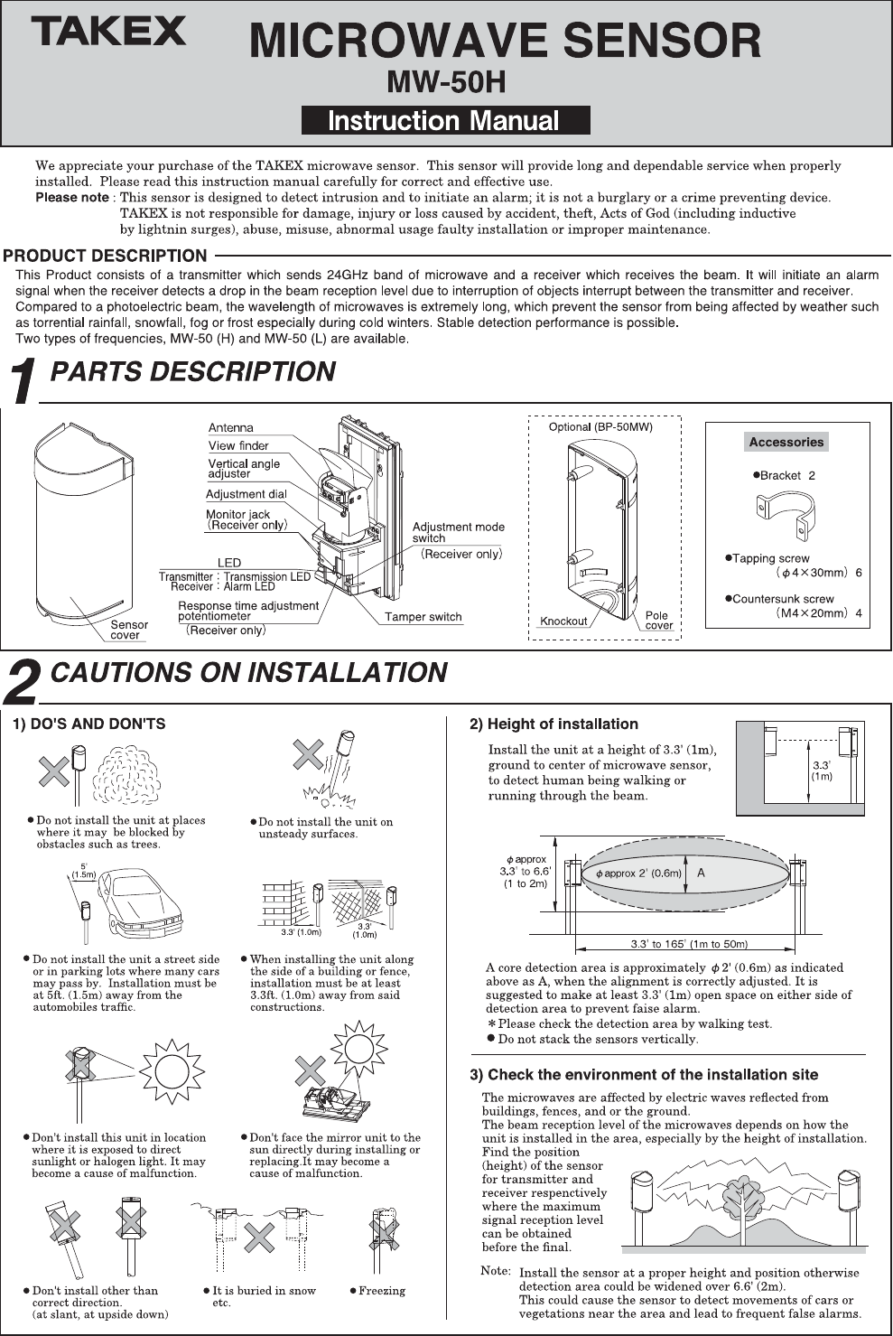 Takex America MW50H100AH 24 GHz Microwave Security Sensors User Manual H