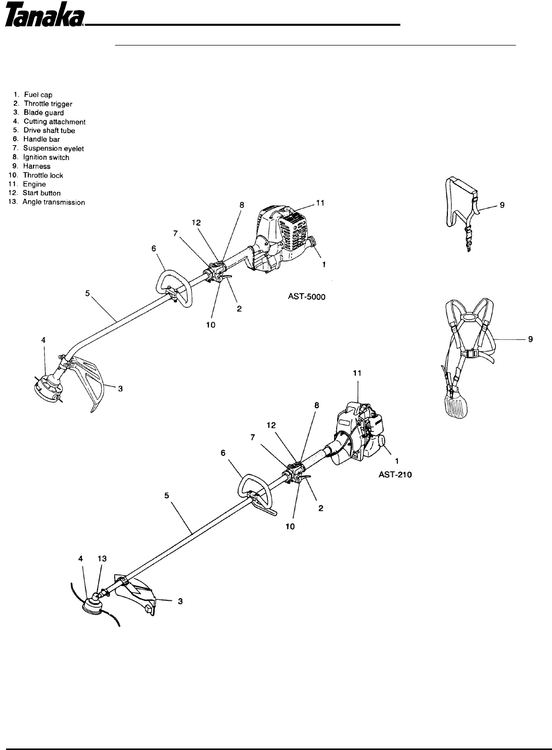 It contains a safety barrier bar, safety shoulder harness and the necessary blade mounting hardware. See your Tanaka
