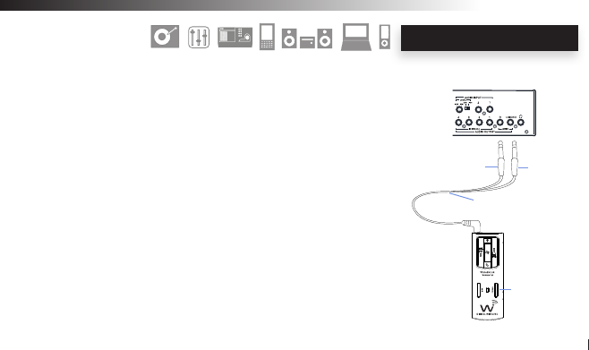 audio source to the dongle size transmitter audio input jacks then connect the dongle size receiver to the