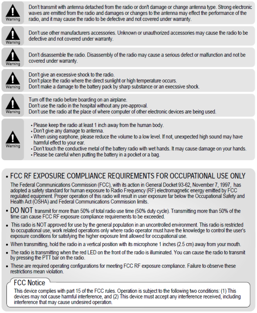 ■ DO NOT transmits for more than 50% of total radio use time (“50%duty cycle”). Transmitting