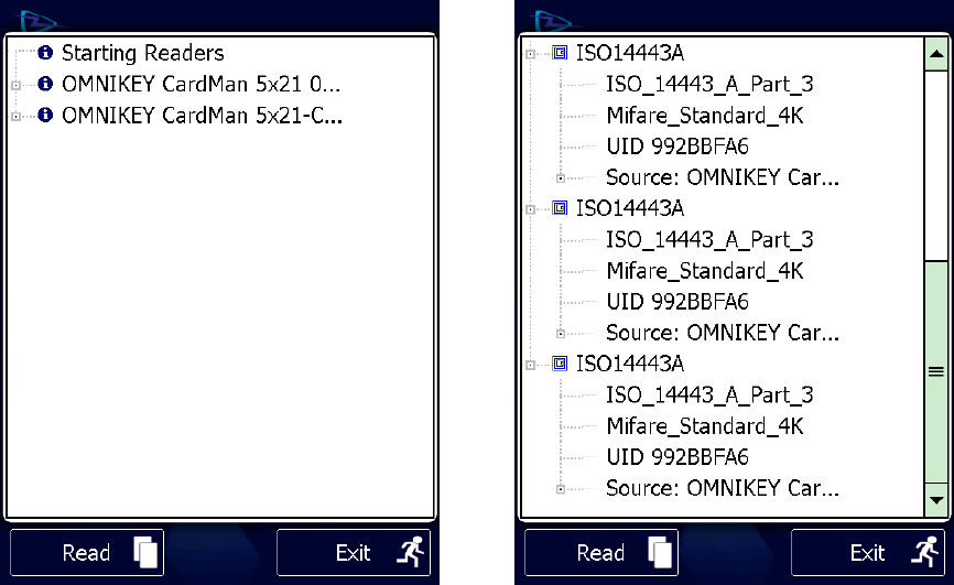 This application demonstrates use of the card reader. While a card is in range is UID and other basic