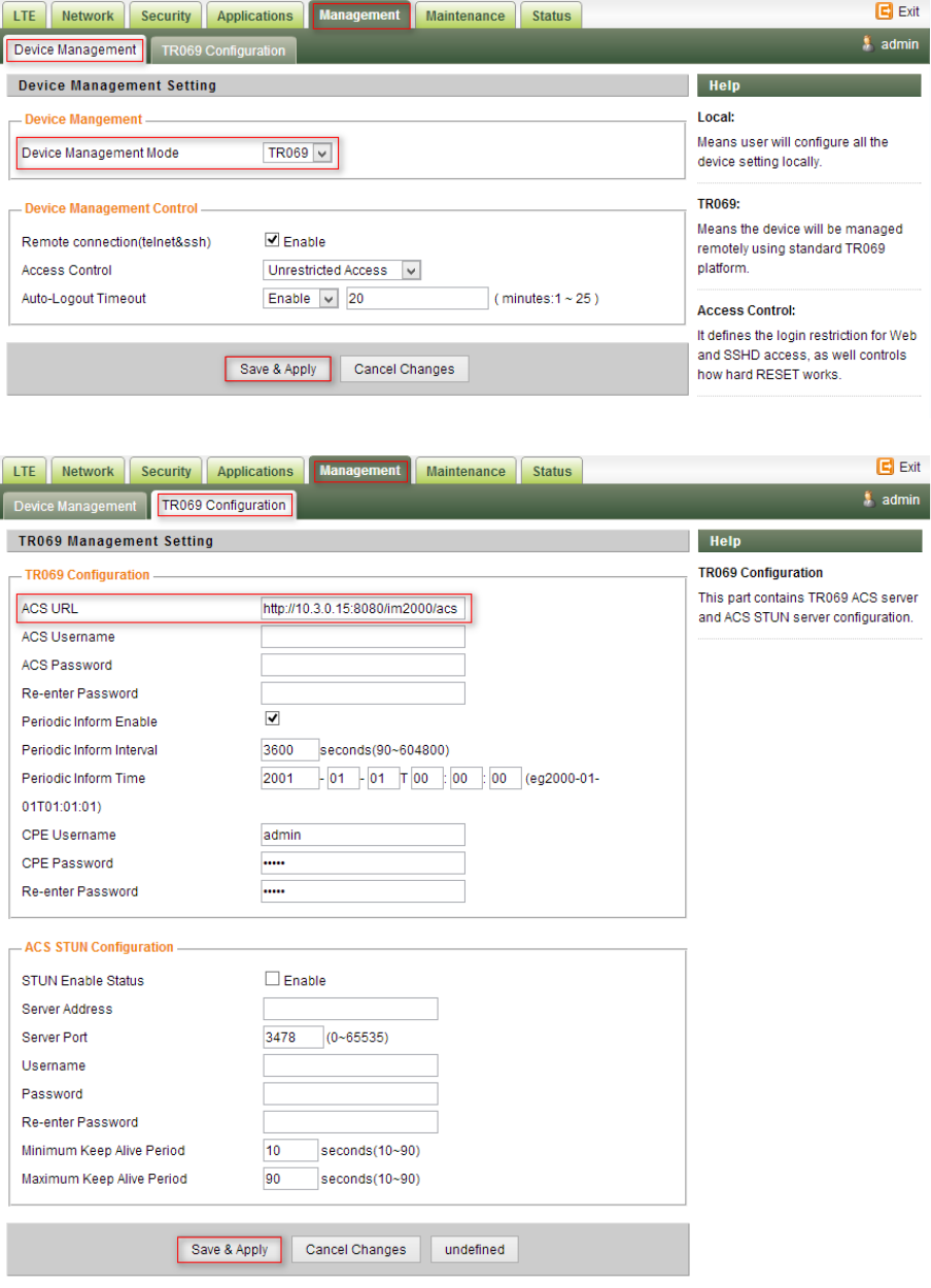 After setting the Device Management Mode as TR069, you must also configure the validity acs url
