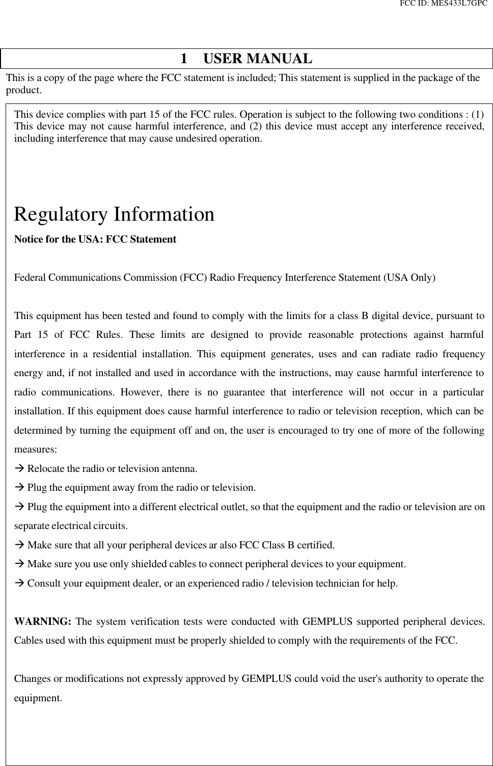 Thales DIS FranceS 433L7GPC Smart Card Reader User Manual manual