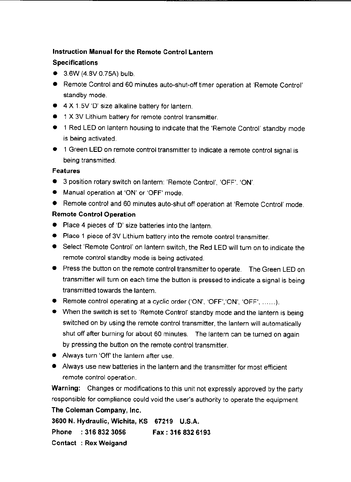 The Coleman Company Inc. Remote Control Transmitter