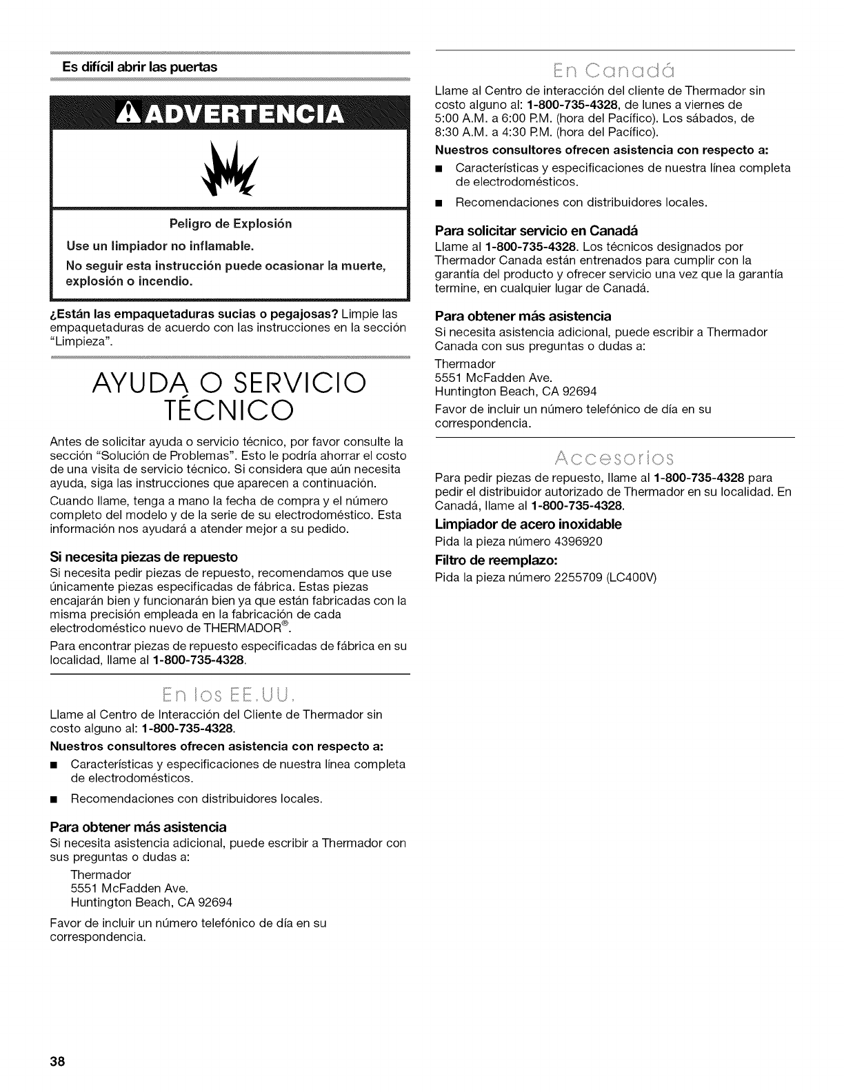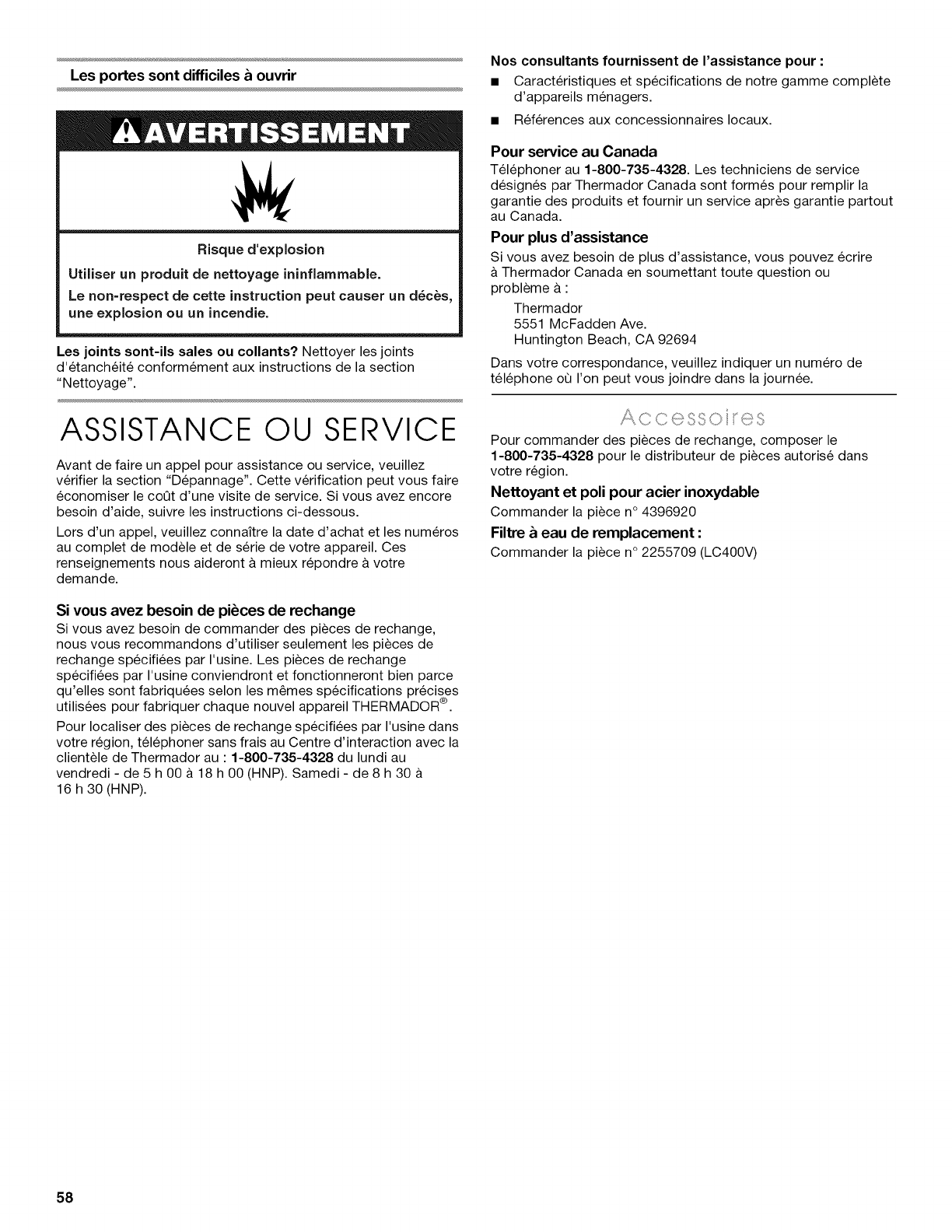 clientele Thermador au 1-800-735-4328 (sans frais), de n'importe oQ aux 12.-U.Au Canada, contacter votre compagnie de service