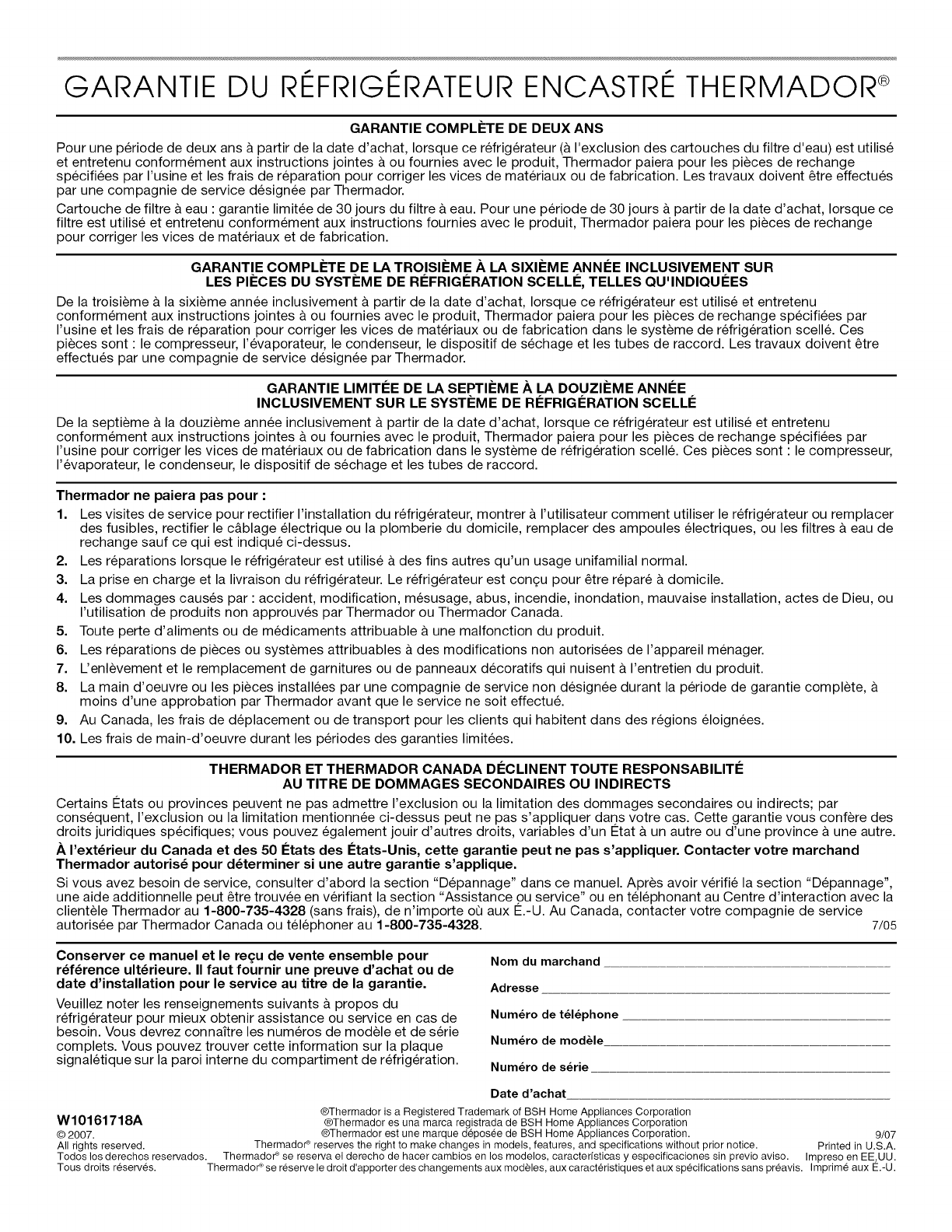 GARANTIE DU RI FRIGI RATEUR ENCASTRI THERMADOR ®