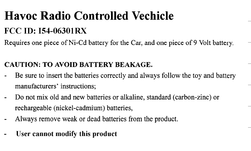 Tiger Electronics 06301RX Havoc Radio Controlled Vehicle User Manual Unknown