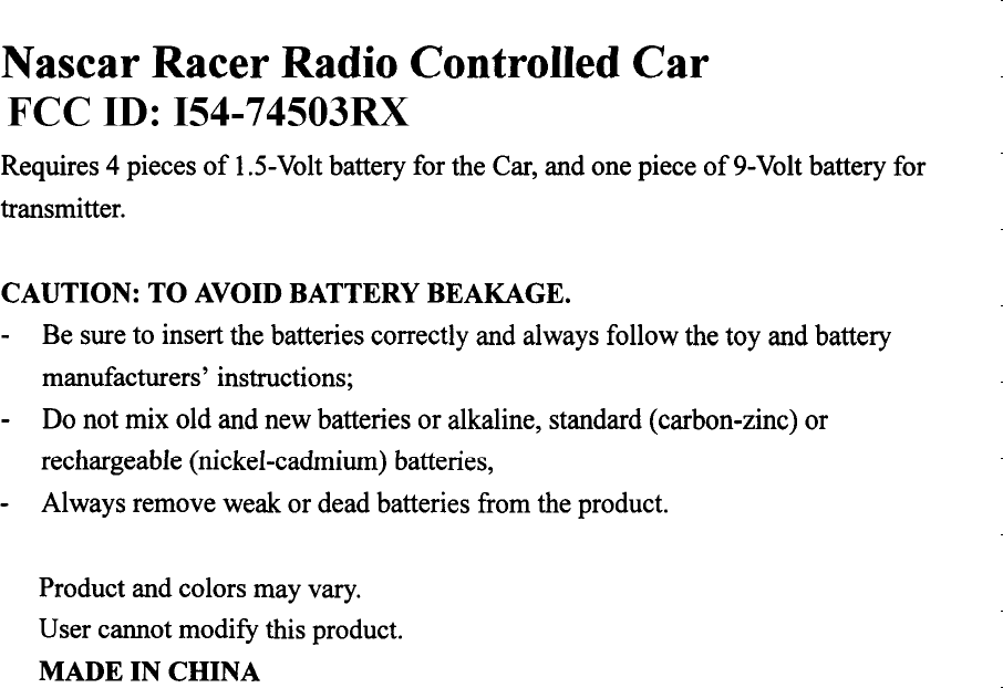 Tiger Electronics 74503RX Nascar Racer Radio Controlled Car User Manual Unknown
