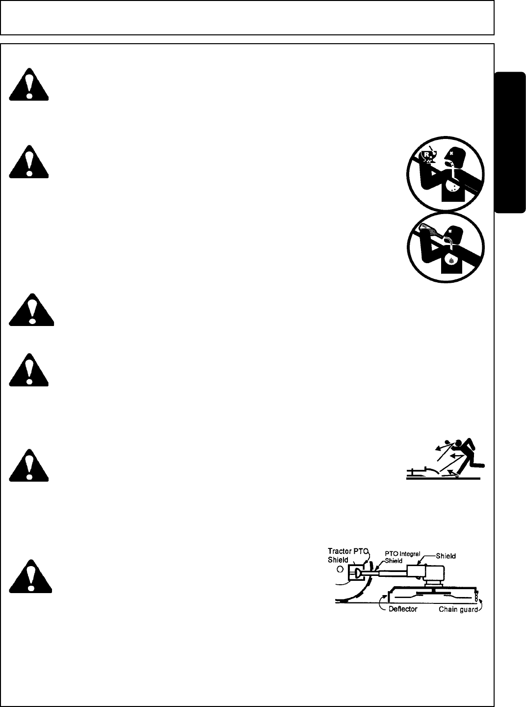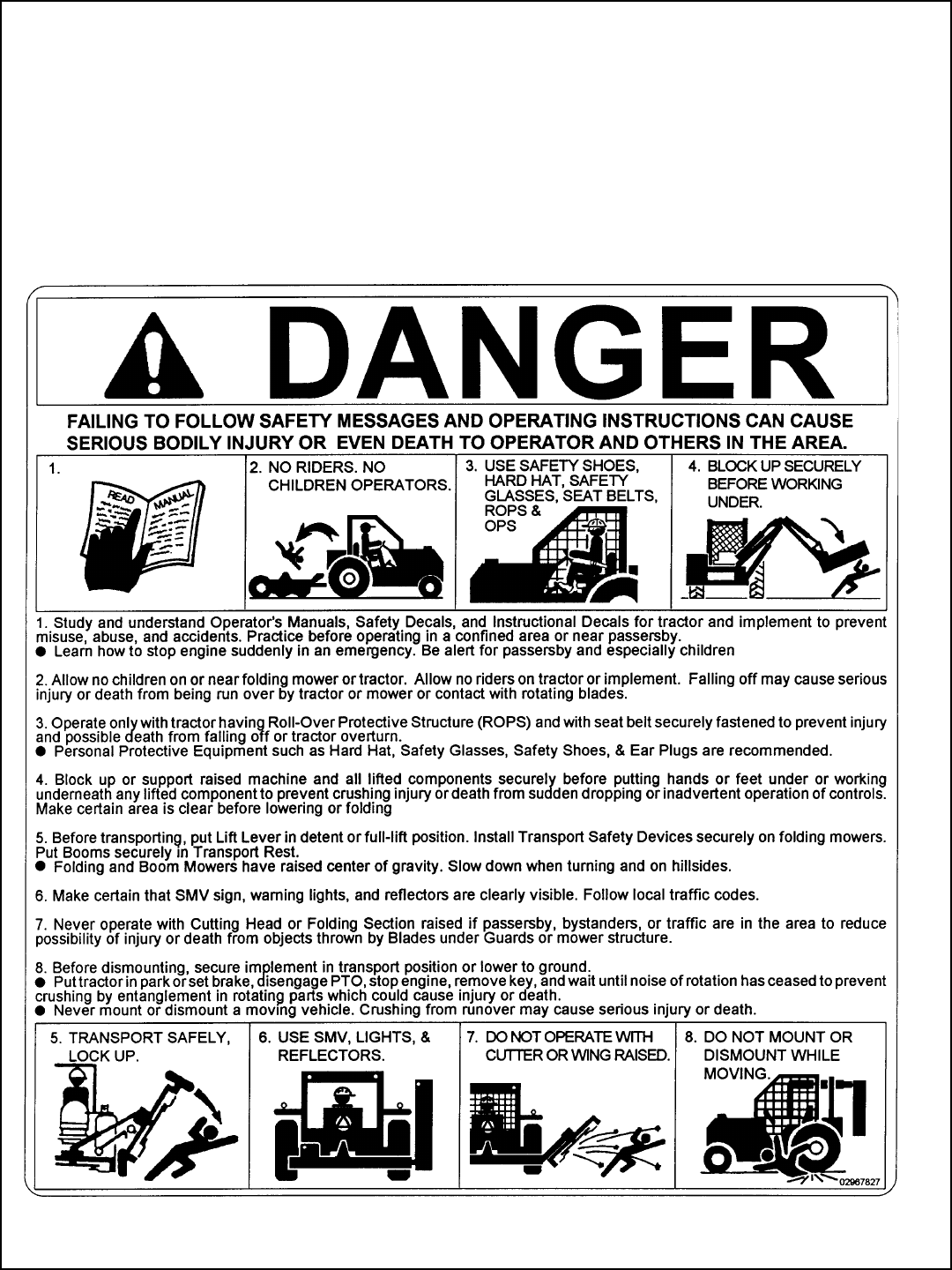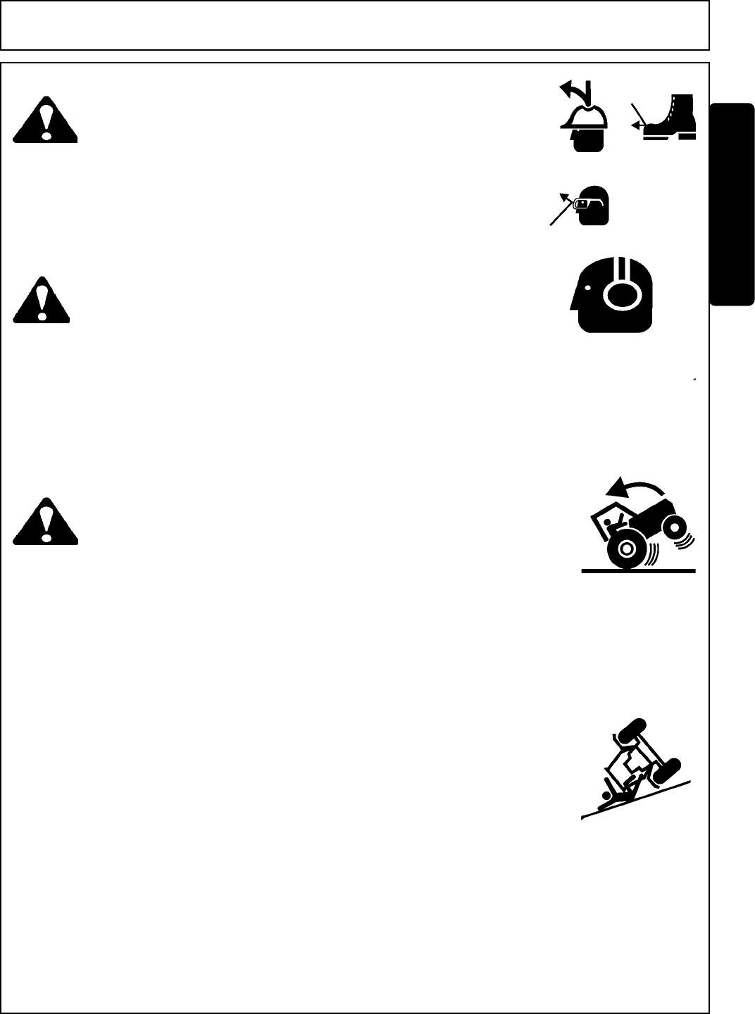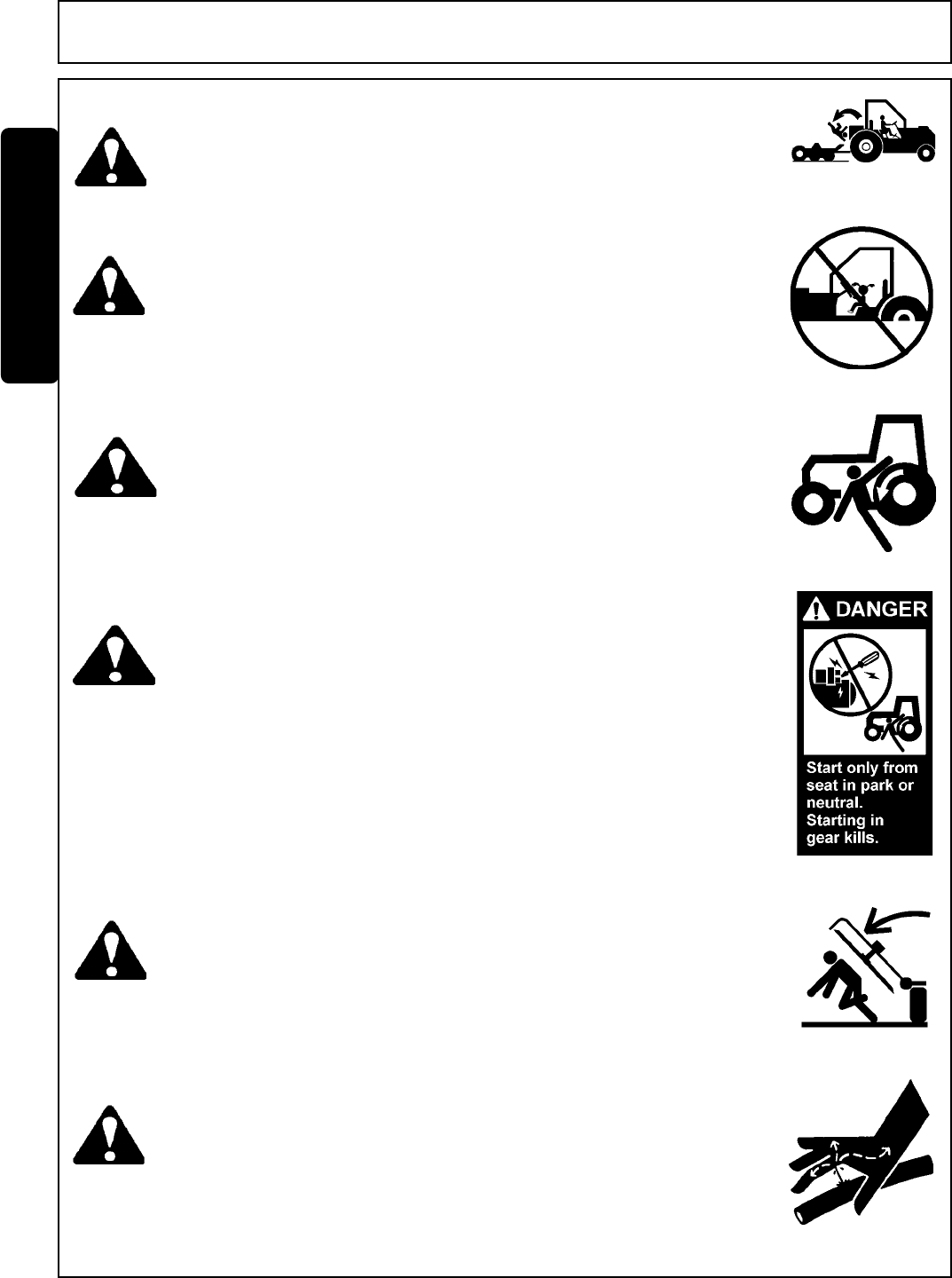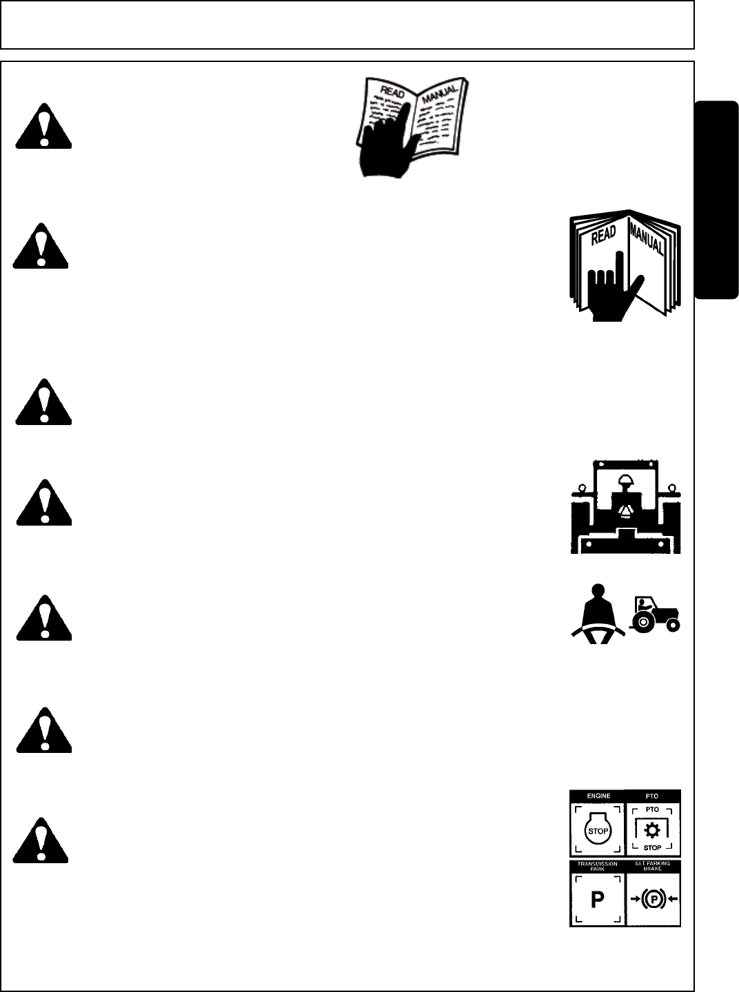 1. Securely fasten seatbelt it the tractor has a ROPS.