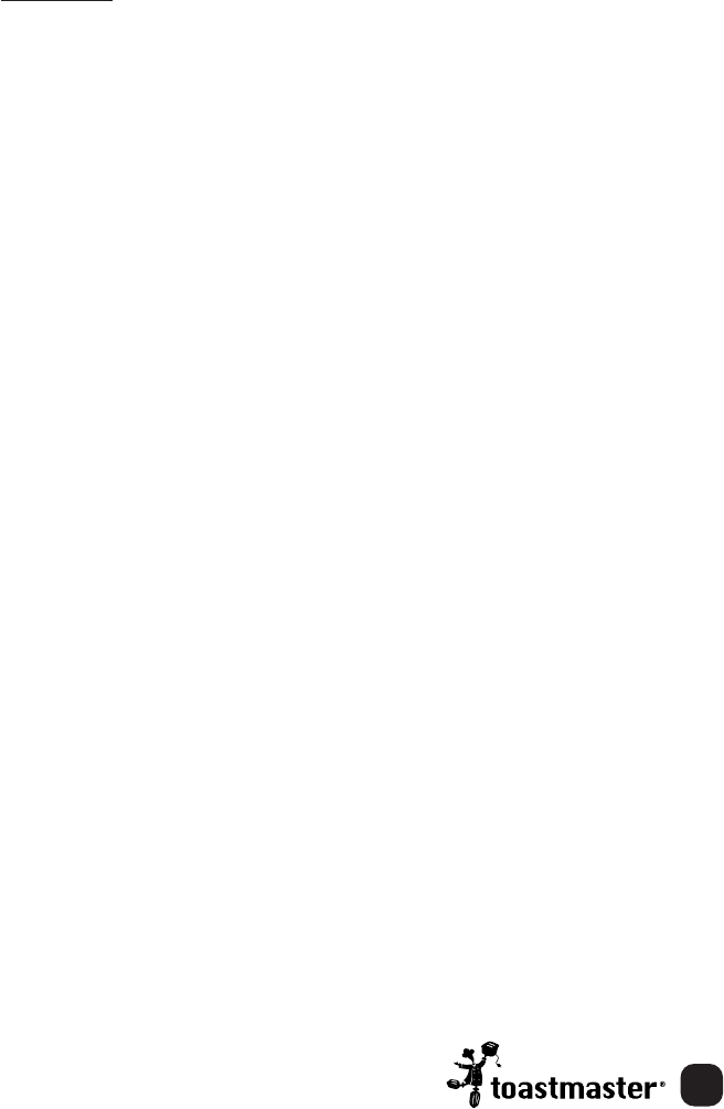 Warranty: This Toastmaster®product is warranted to be free from defects in materials or workmanship for a period of