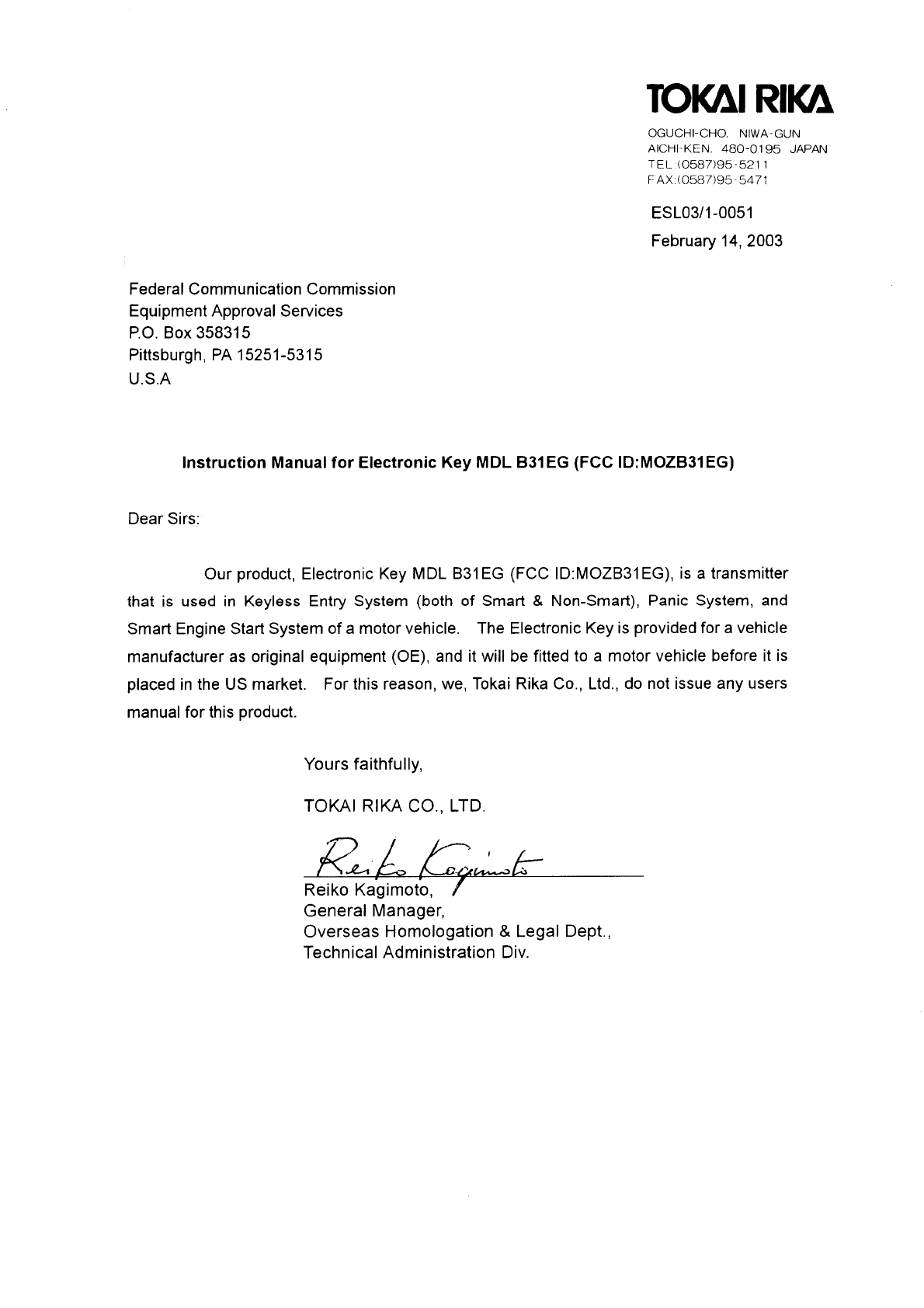 Tokai Rika Co B31EG Electronic Key Transmitter for Car Keyless System User Manual