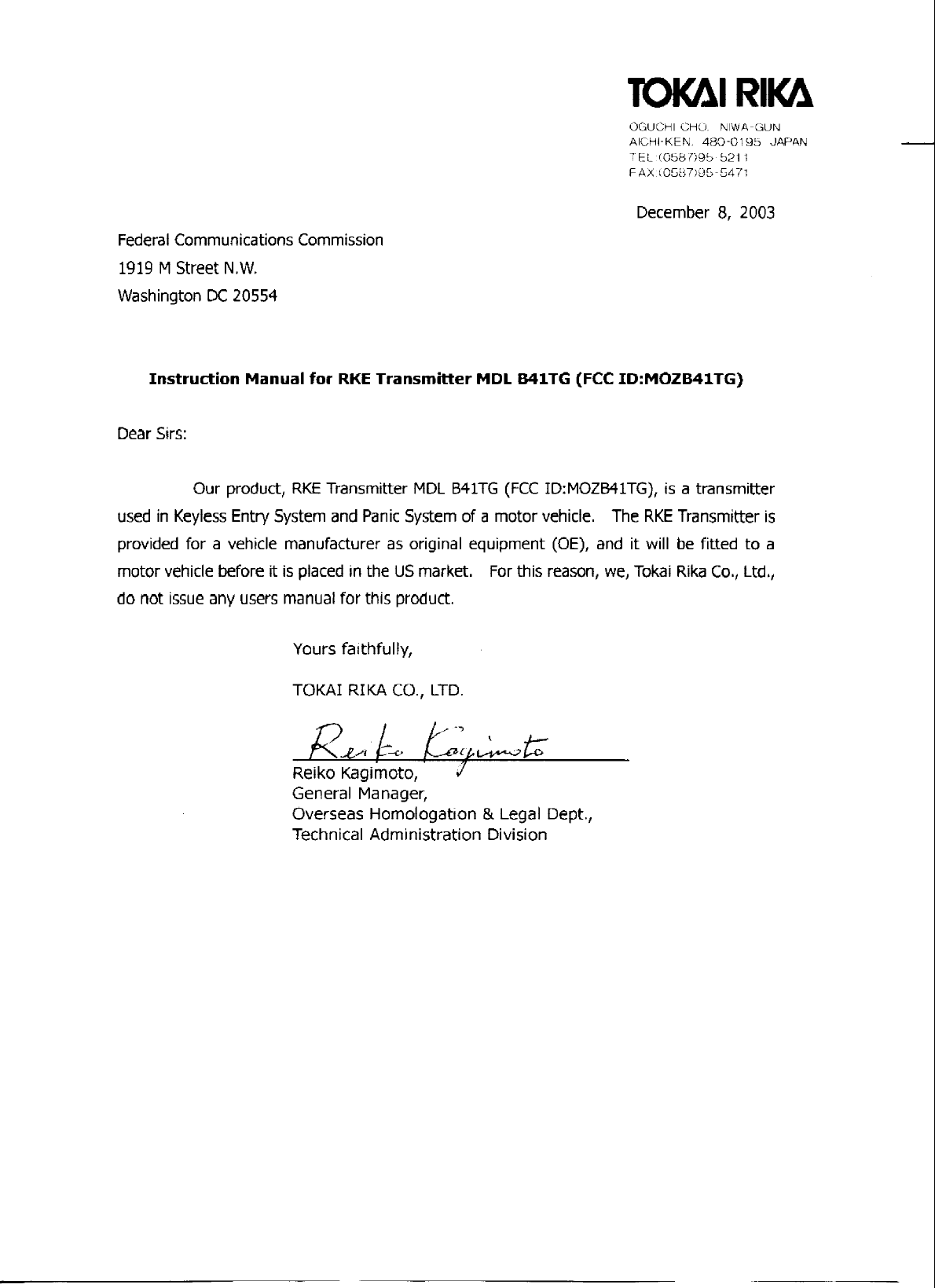 Tokai Rika Co B41TG RKE Transmitter User Manual