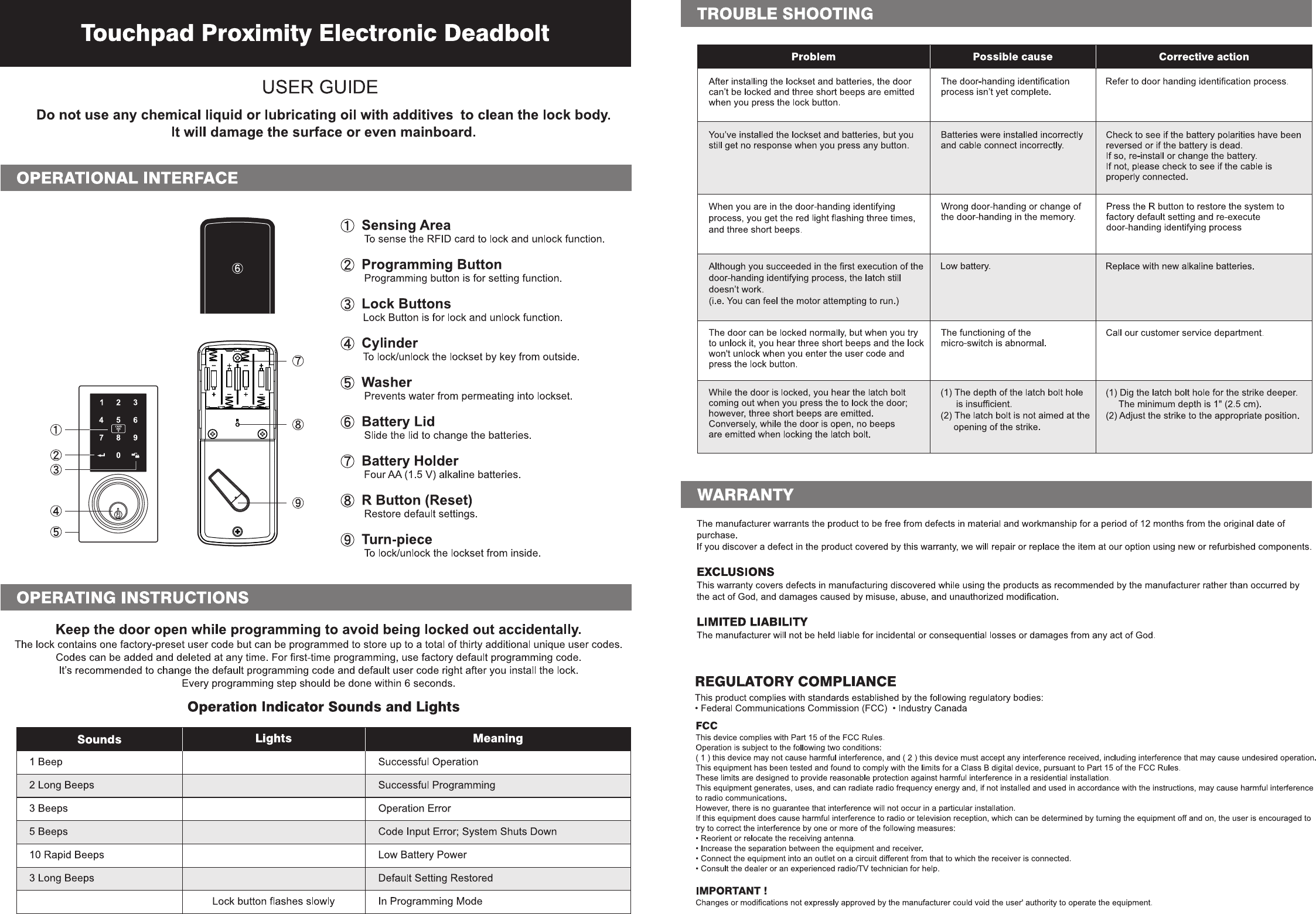 Tong Lung Metal Industry PL2-TR Touchpad Proximity Electronic Deadbolt User Manual