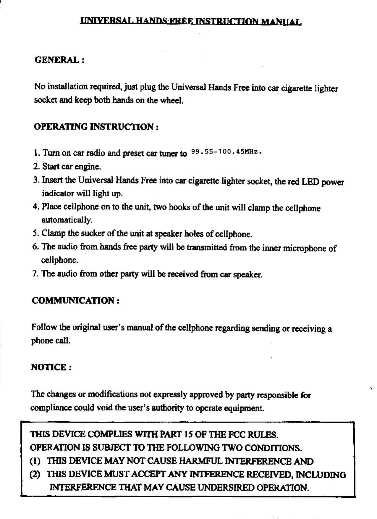 Topcell Technology TOPUHF01 Universal Hand Free User Manual