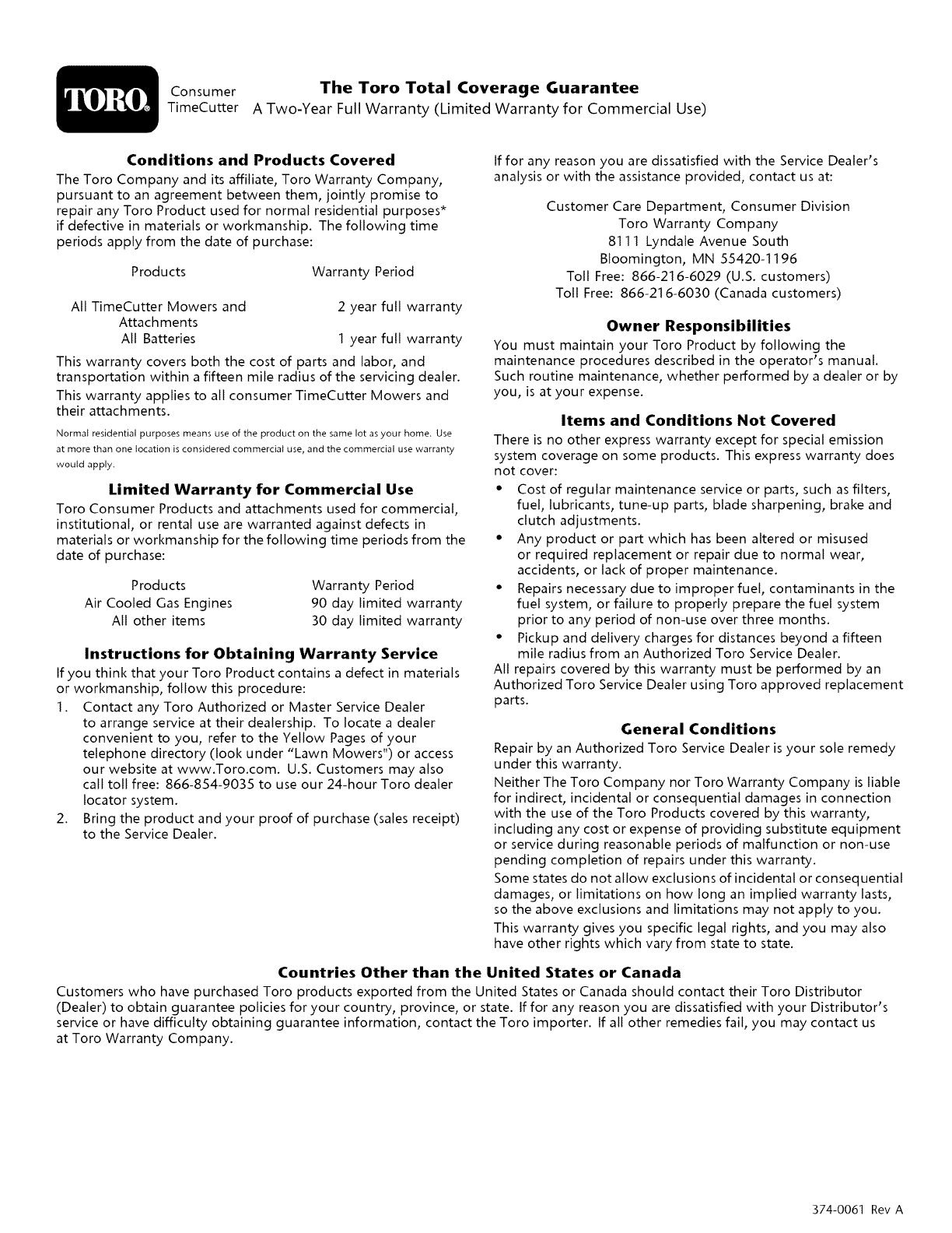Consumer The Toro Total Coverage Guarantee