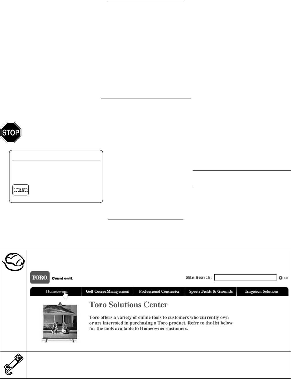 will be necessary to use the manufacturer’s web site and/or help from a Toro Service Dealer.