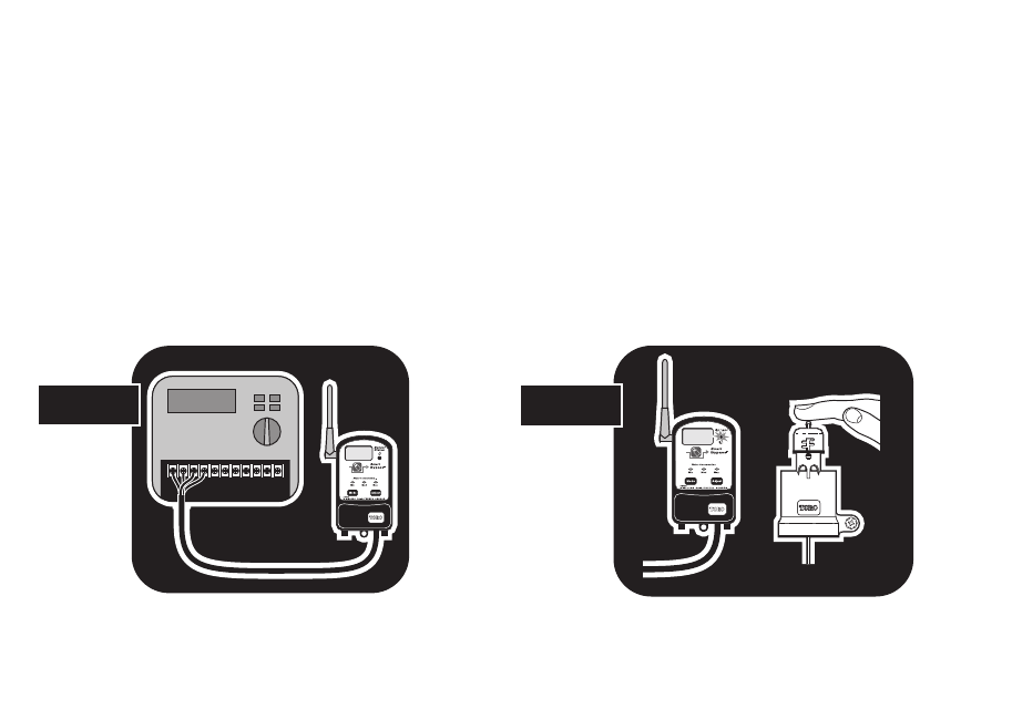 and a sensor module with built-in transmitter. The receiver installs next to the irrigation controller