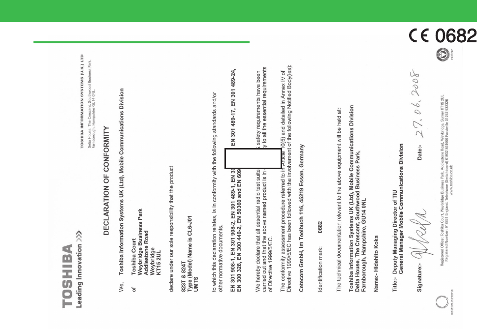 Toshiba Information Systems (UK) Ltd, Mobile Communications Division Cellular Mobile Phone 830T indb
