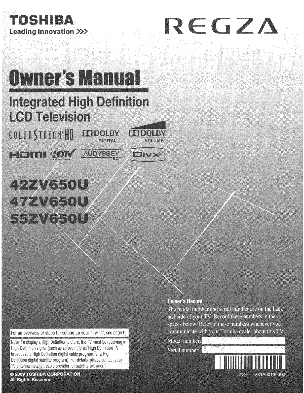 User Manual: Toshiba 42ZV650U 42ZV650U TOSHIBA LCD TV - Manuals and Guides View the owners manual for your TOSHIBA LCD TV #42ZV650U. Home:Electronics Parts:Toshiba Parts:Toshiba LCD TV Manual