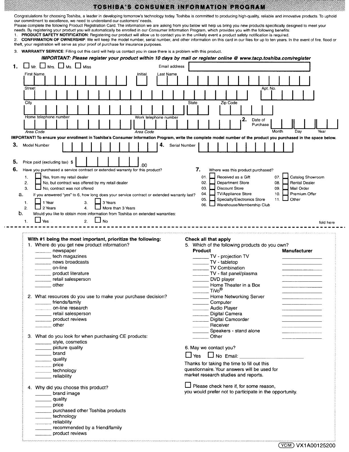in Toshiba's Consumer Information Program, write the complete model number of the product you purchased in the space below,