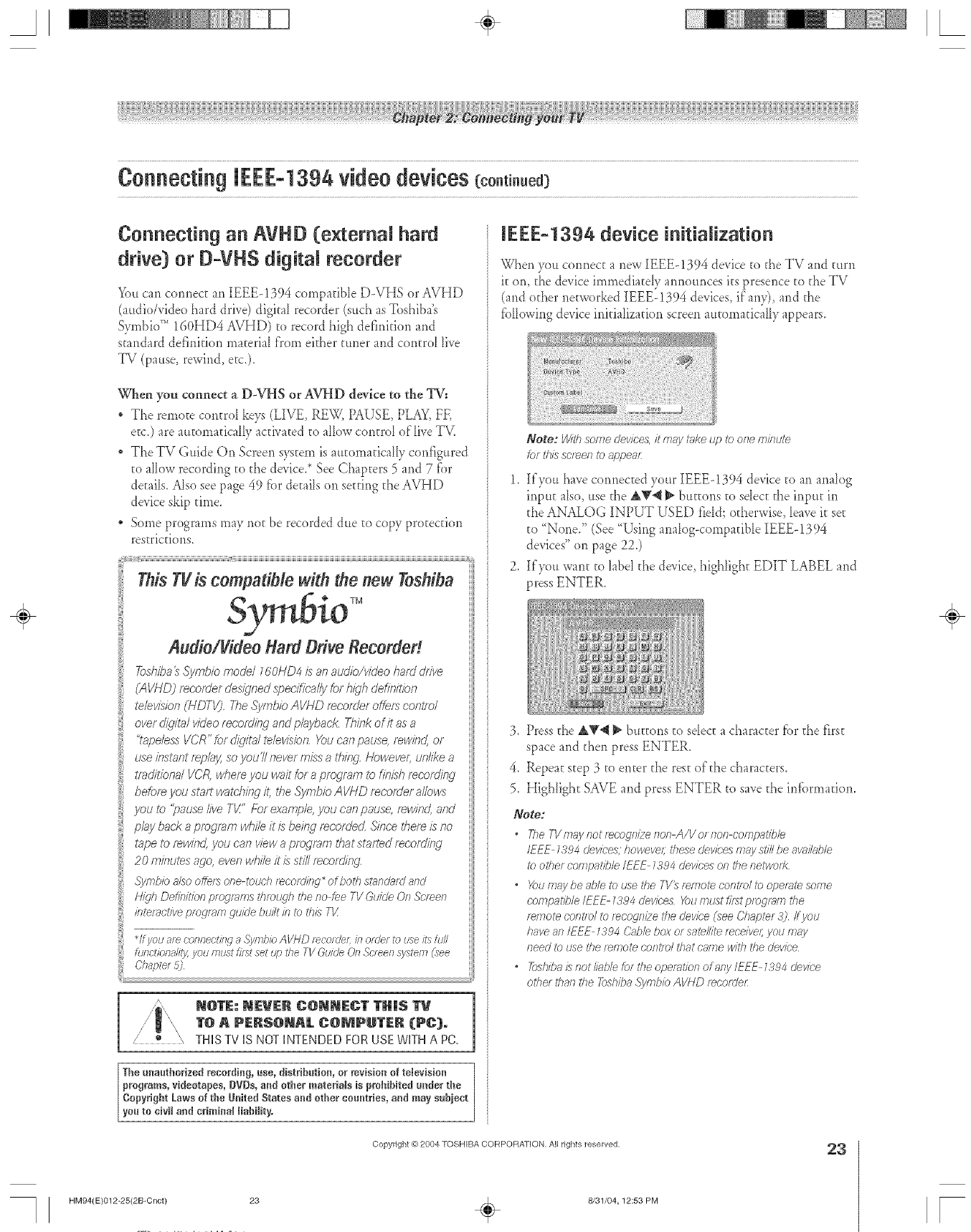 /o ', THIS TV IS NOT INTENDED FOR USE WlTH A PC.