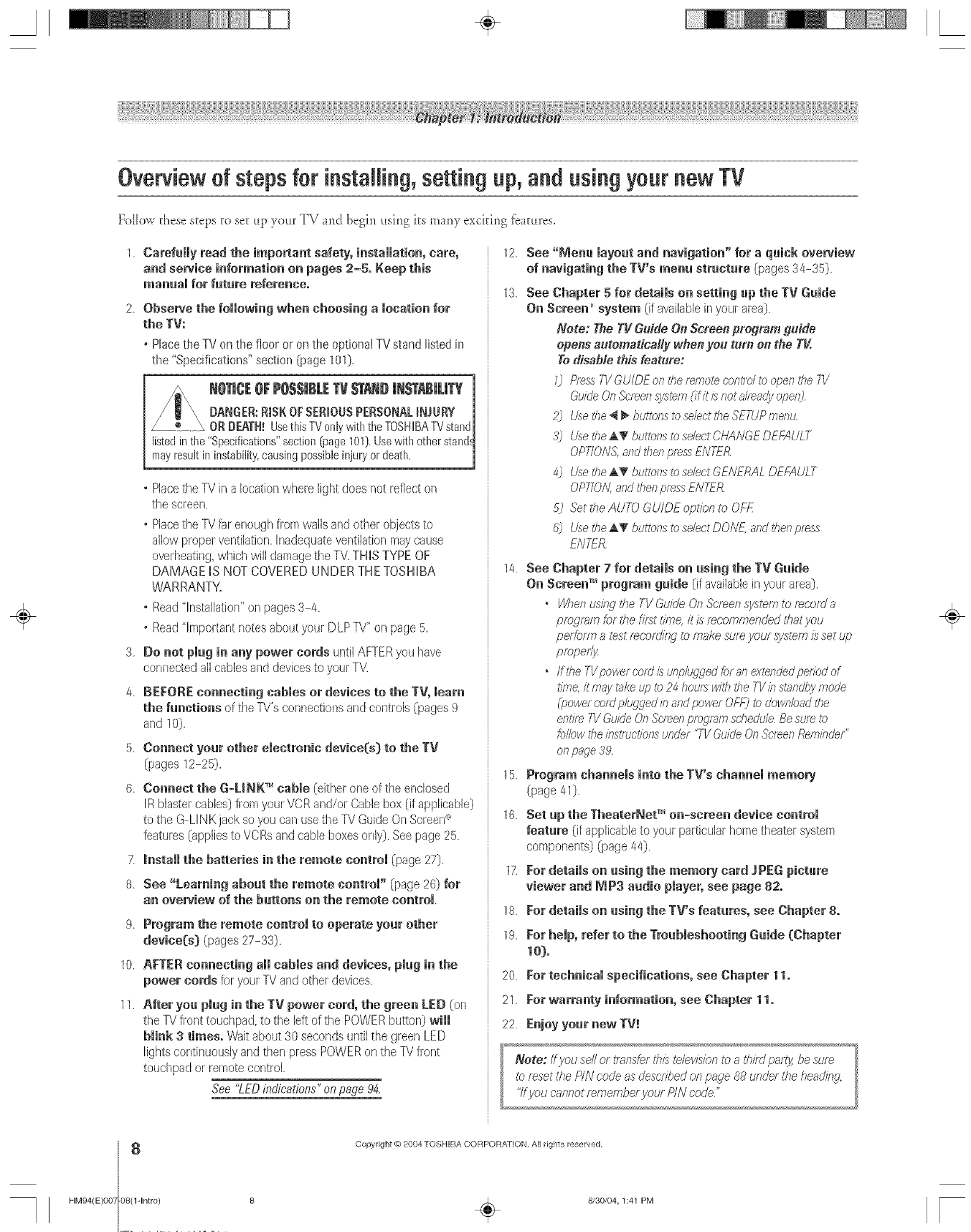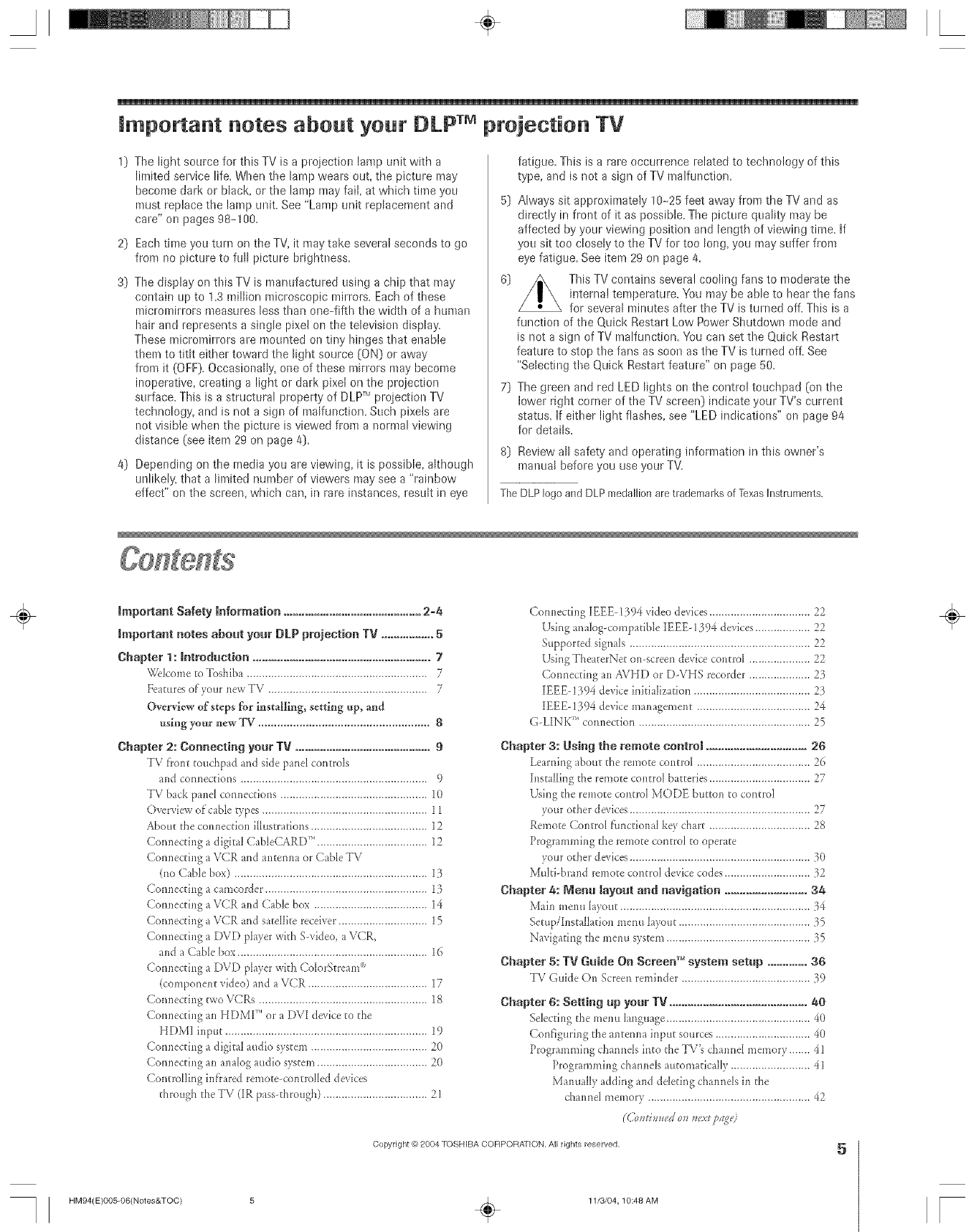 TOSHIBA DLP Television Manual L0523085 TOSHIBA DLP Television Owner's Manual, TOSHIBA DLP Television installation guides