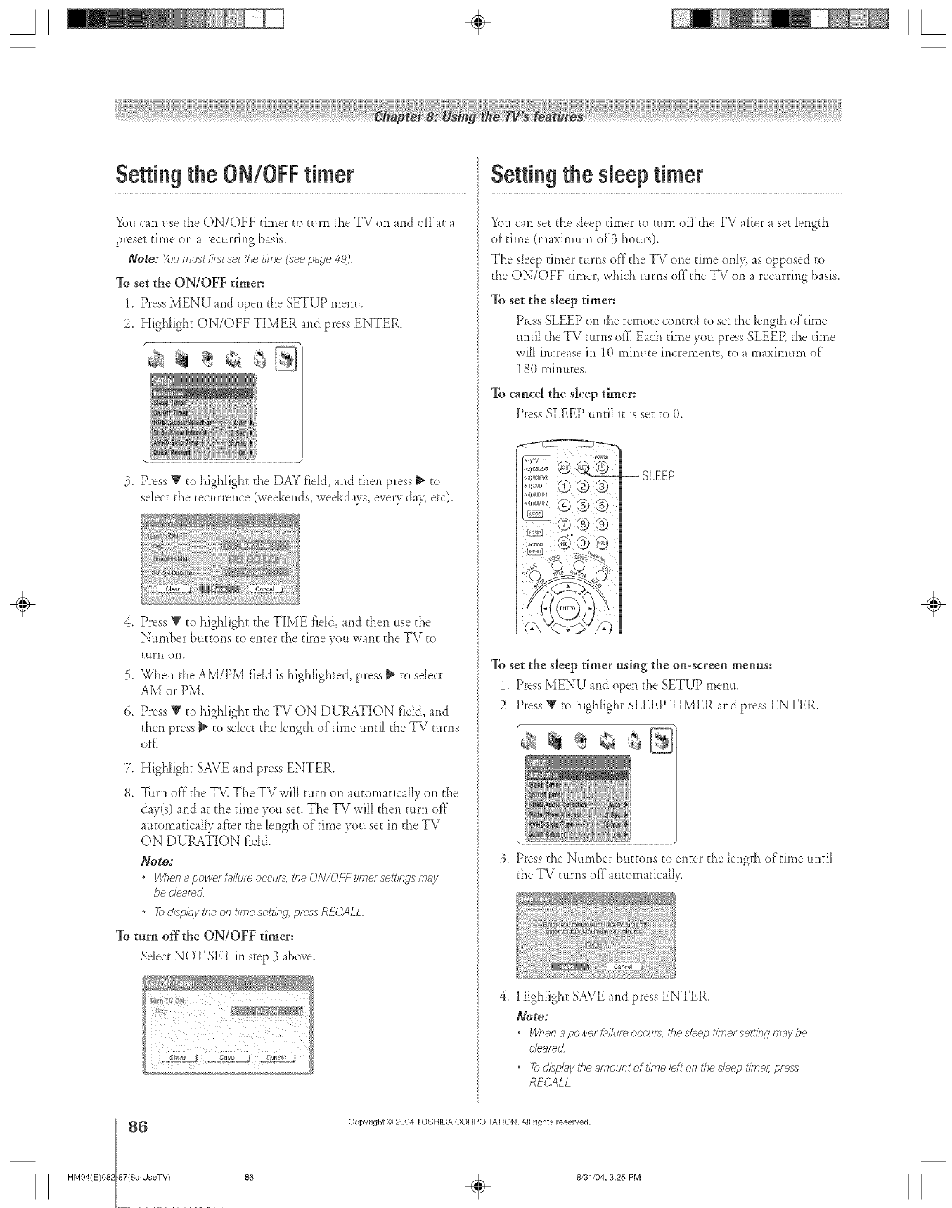 ON/OFF timer ............................................................................86