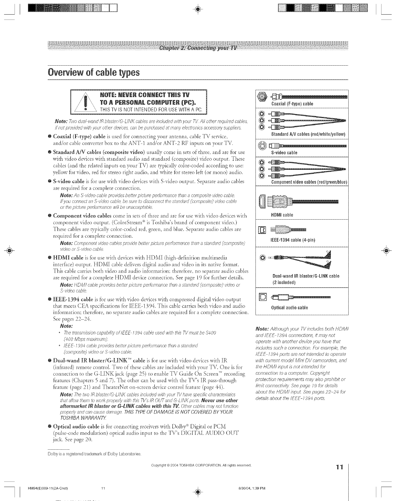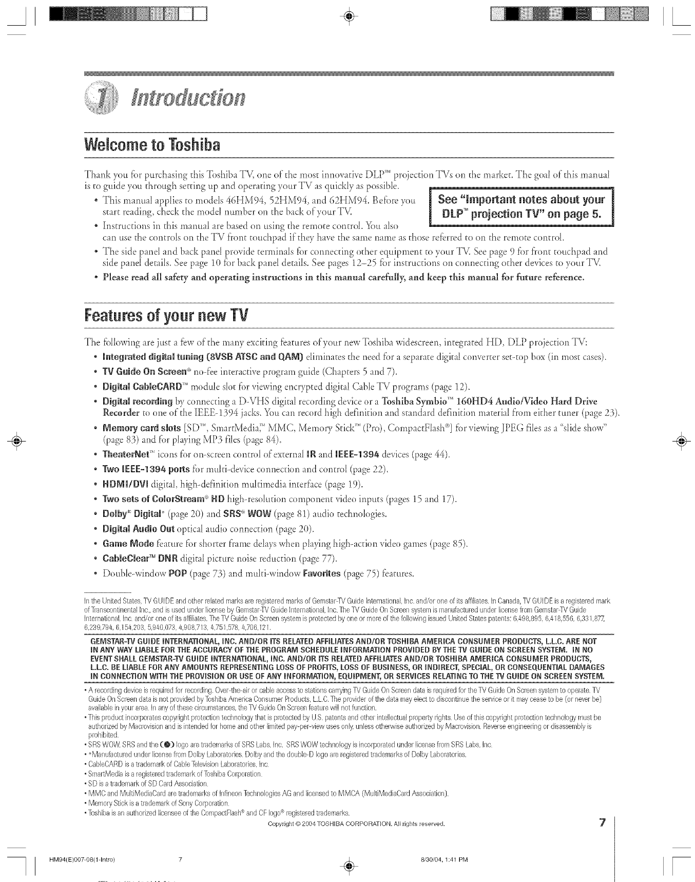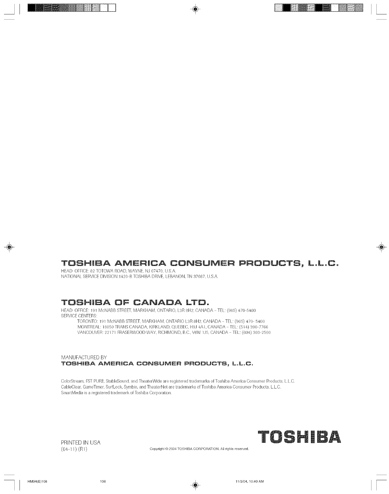 ColorStream, FSTPURE StabieSound, and TheaterWkte are registered trademarks of Toshiba America Consumer Products, LLC