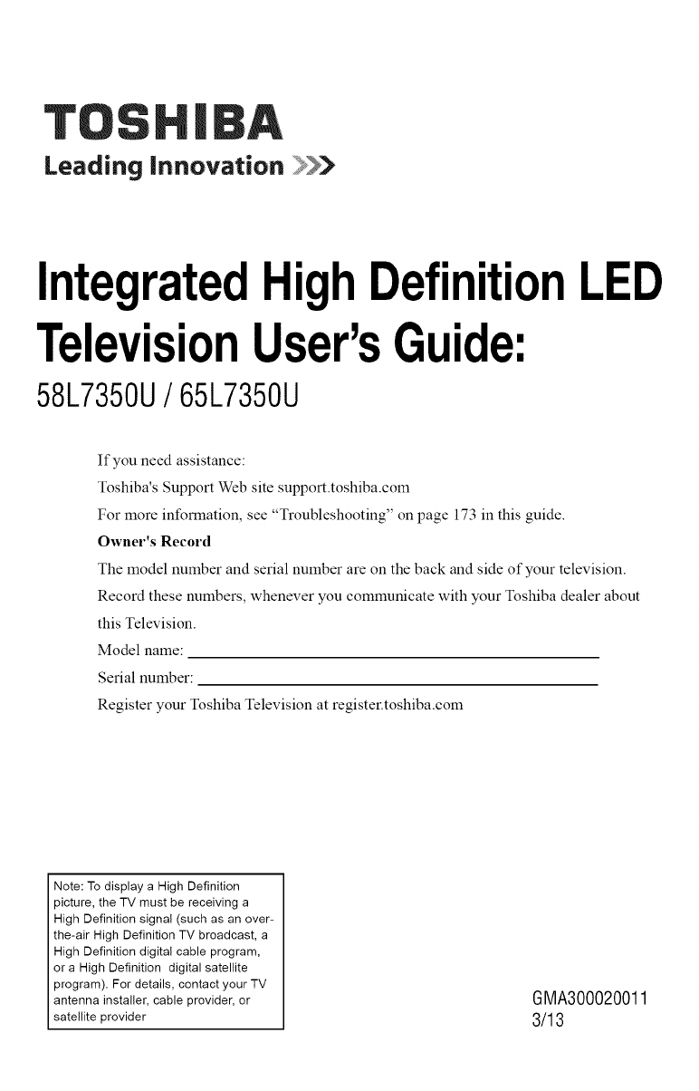 Toshiba 65L7350U User Manual LED TELEVISION Manuals And Guides 1307098L