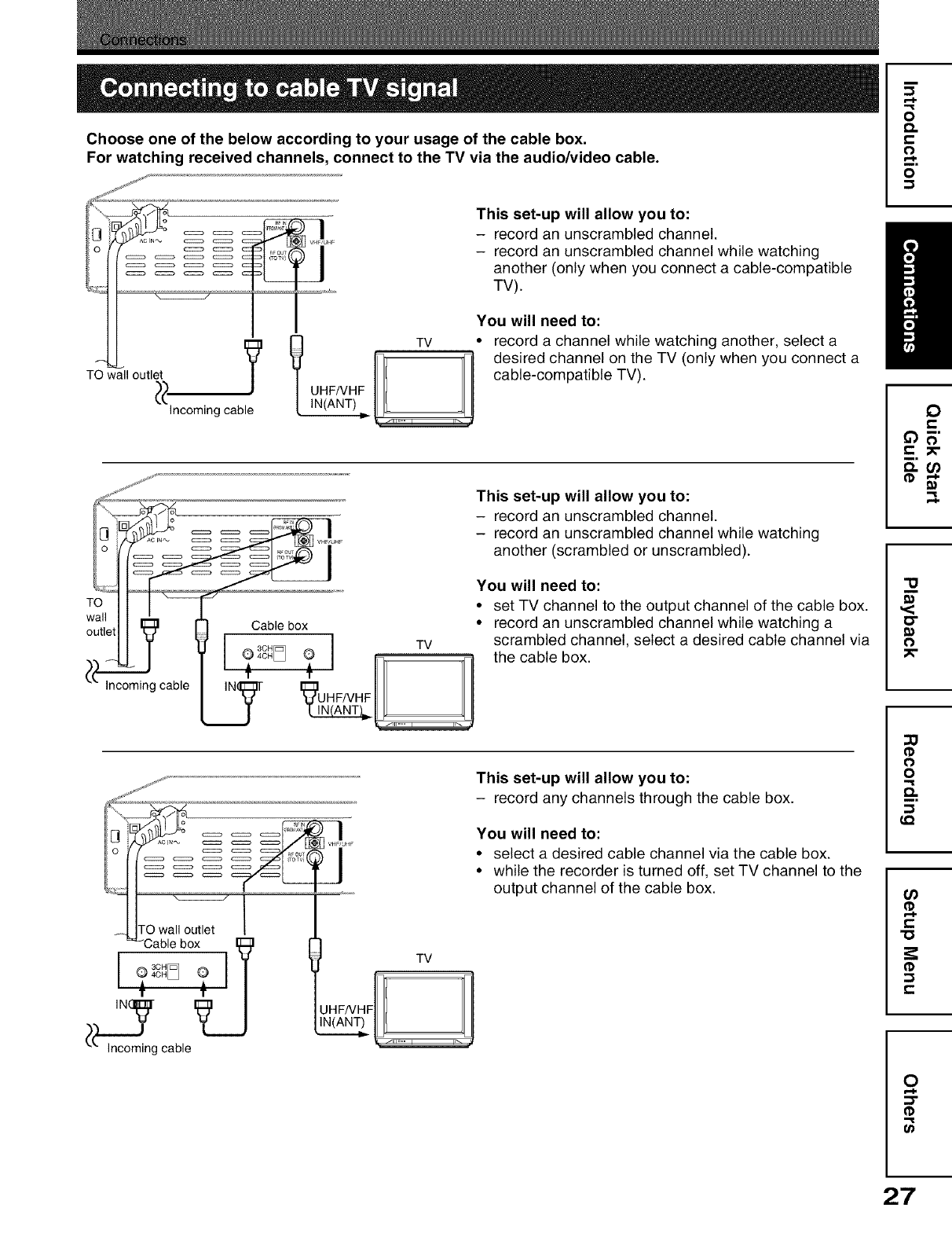 Connecting to cable TV signal .................................... 27