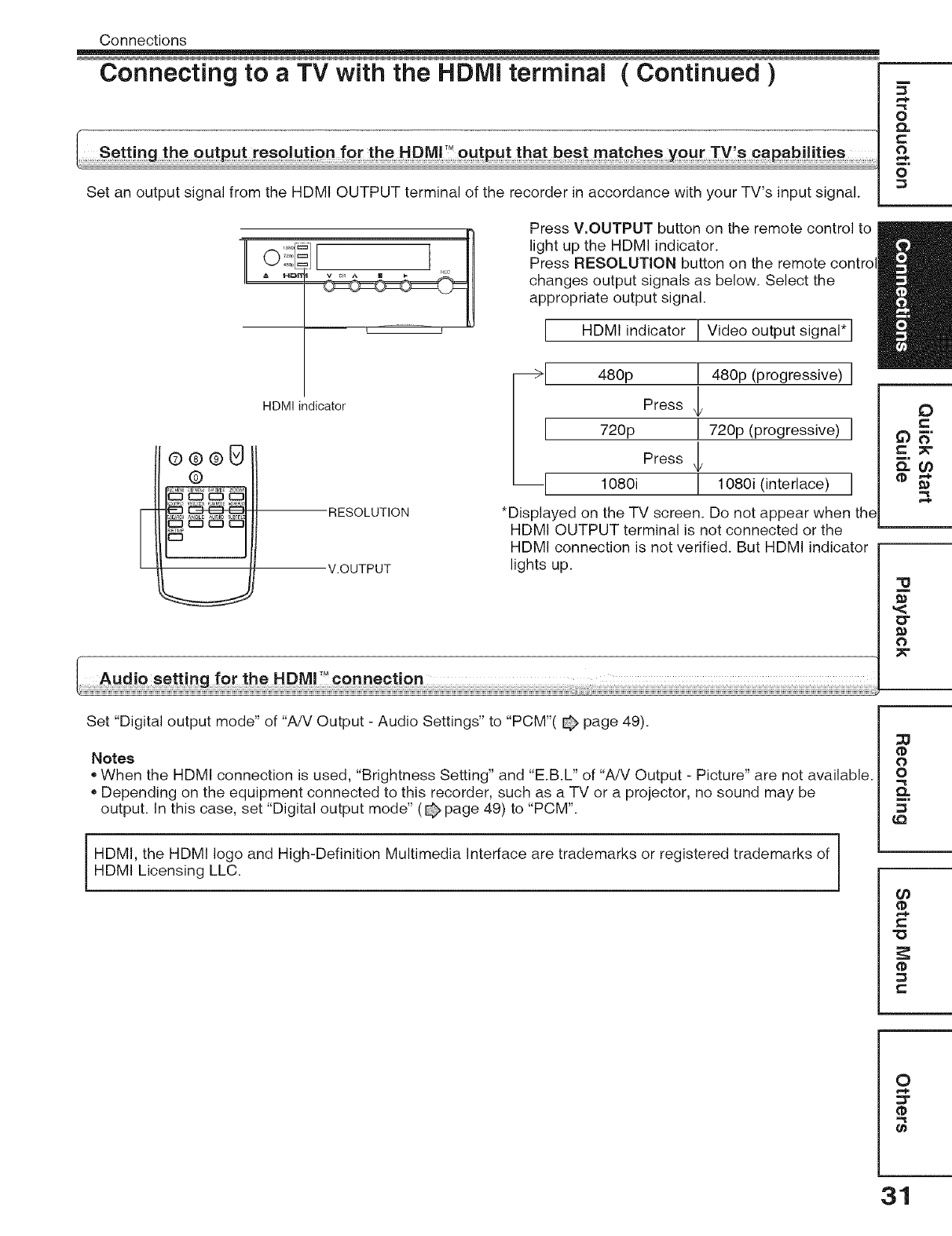 Audio setting for the HDMI T''connection ................................... 31