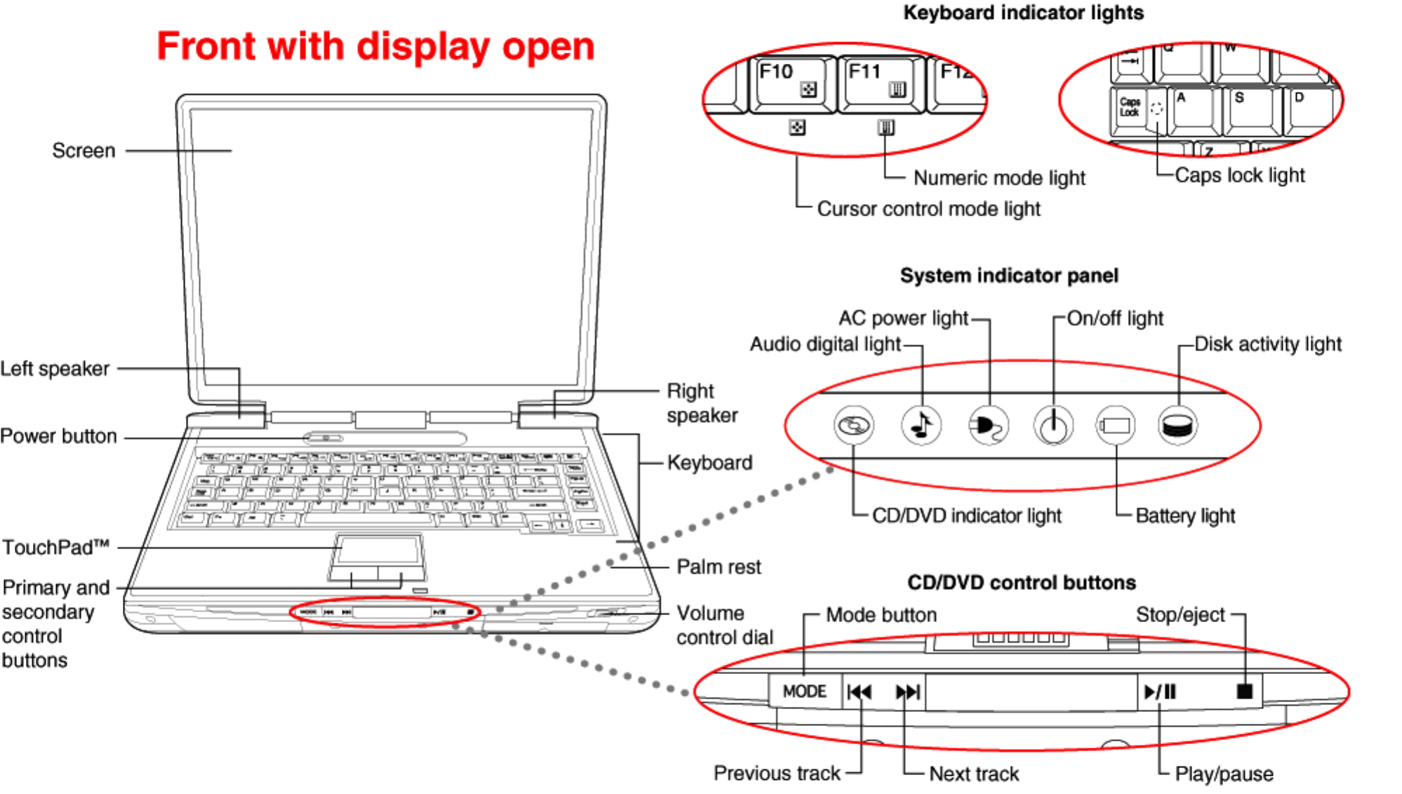 • LED Indicators: HDD, CD/DVD, DC-IN, Caps Lock, Arrow, Numeric