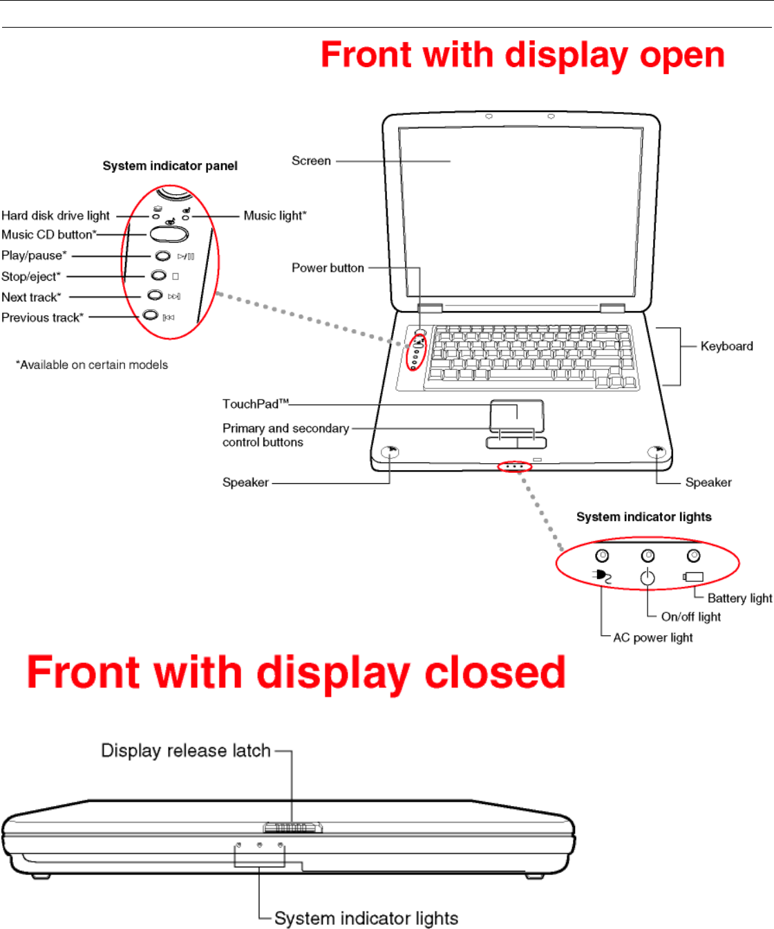 • Indicators: Power, Hard Drive, CD/DVD-ROM, Wireless