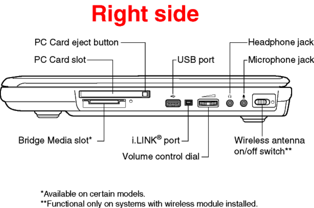 TV-Out, i.LINK™1394, Bridge Media Adaptor, CD Play/Instant Play button, Microsoft Windows