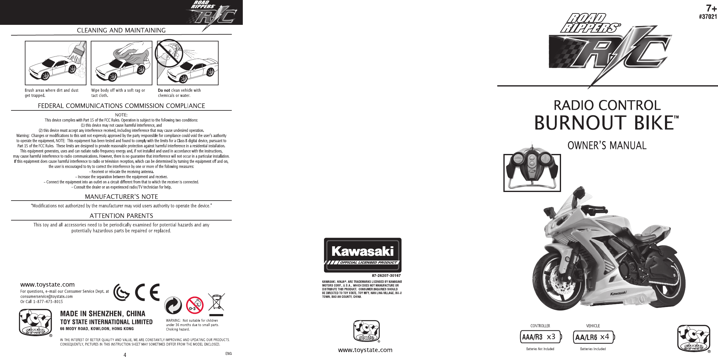 Toy State 37021F27 Radio Control Burnout Bike R/C User Manual 37021 RRrc InstBkAL 050713 OL