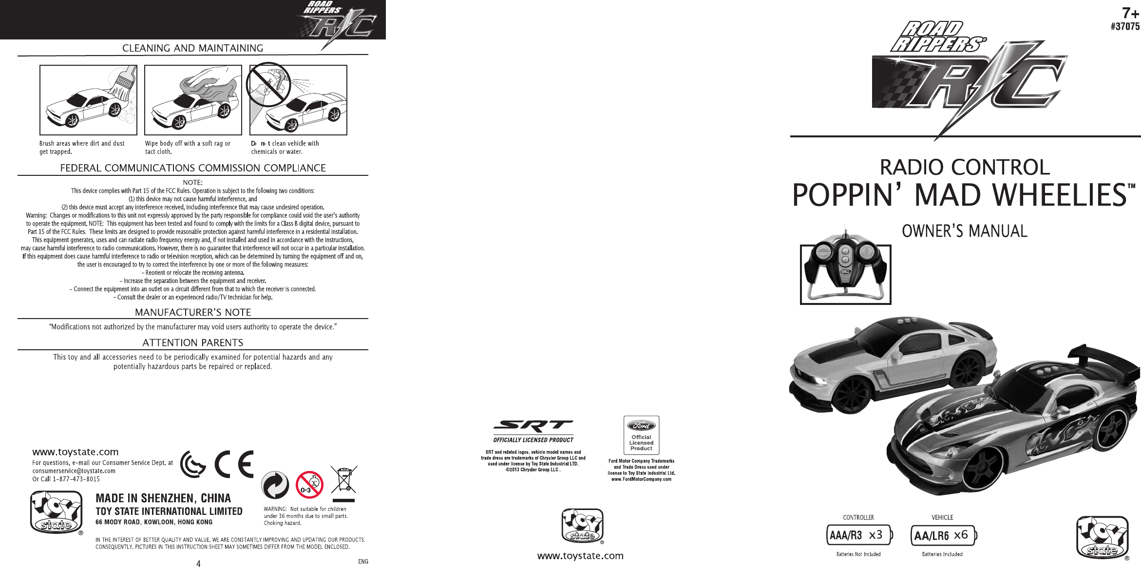 Toy State 37075F27 Poppin Mad Wheelies TM R/C - Ford Mustang Boss 302 User Manual