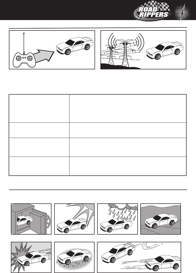 • Remove batteries from R/C vehicle and controller if vehicle will not be used for a long