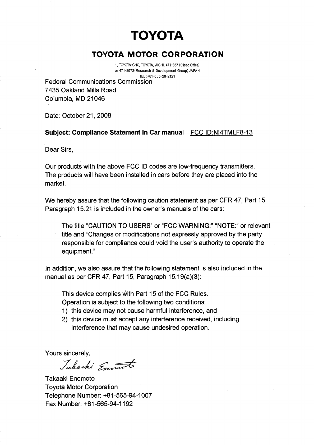Toyota Motor TMLF8-13 Smart LF Oscillator User Manual Declaration