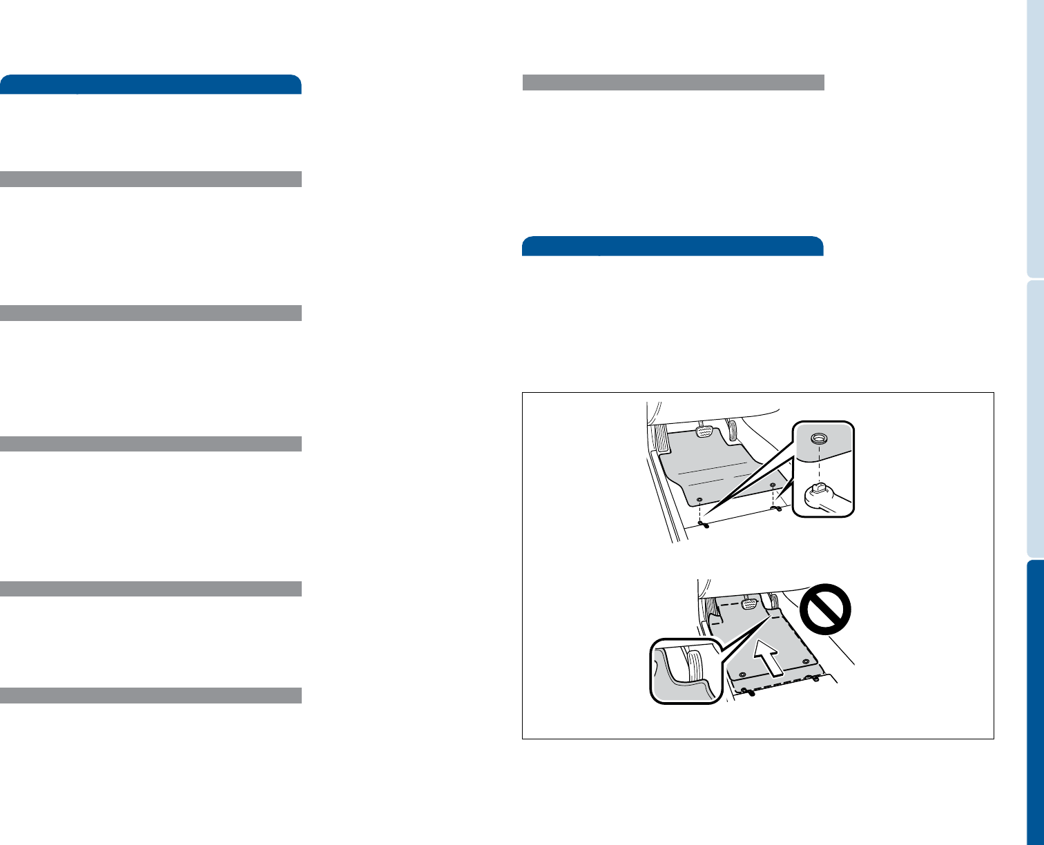 • Use only one floor mat at a time, using the retaining hooks to keep the mat in