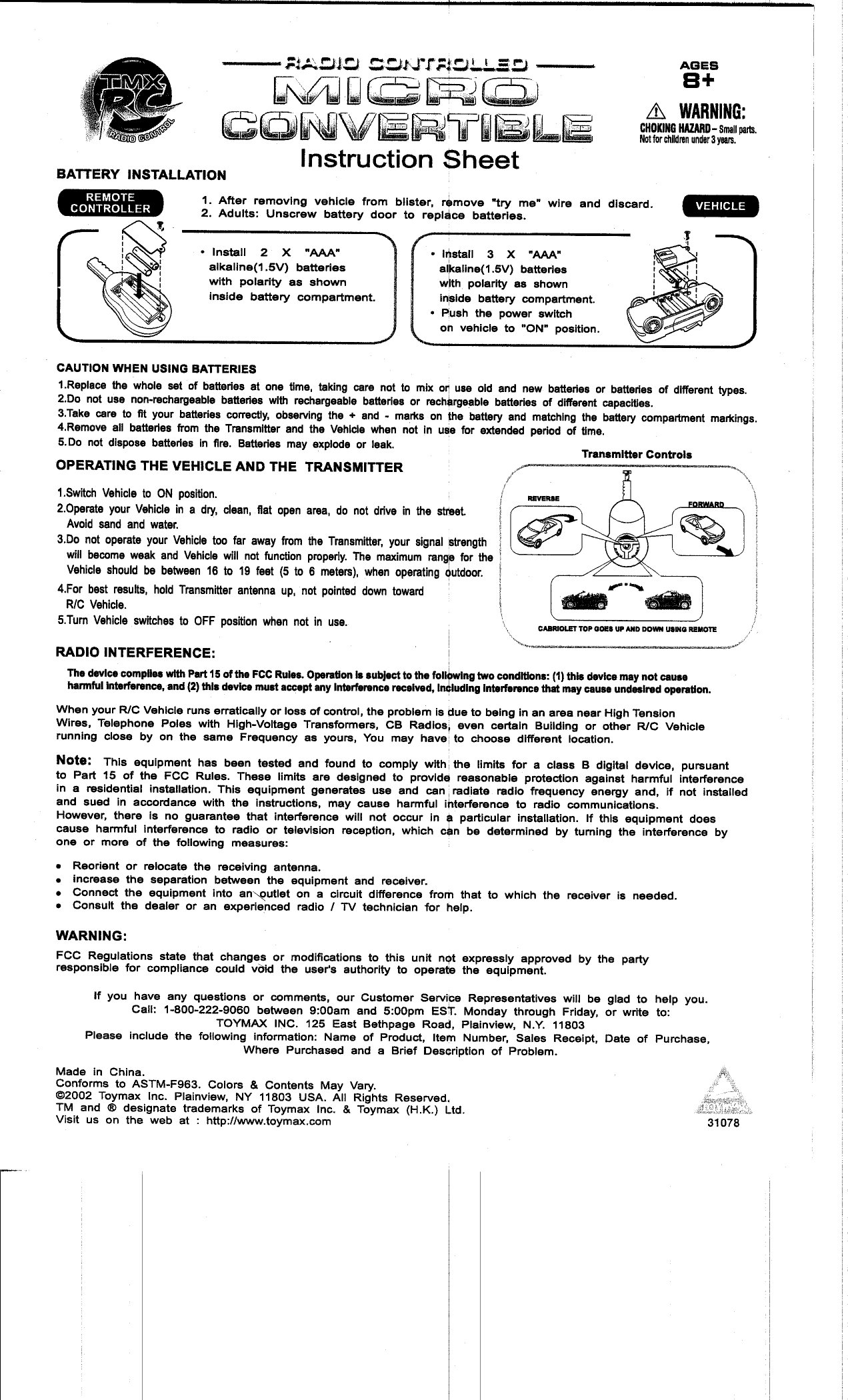 Toys World Electronic Limited Radio Control Car Users Manual