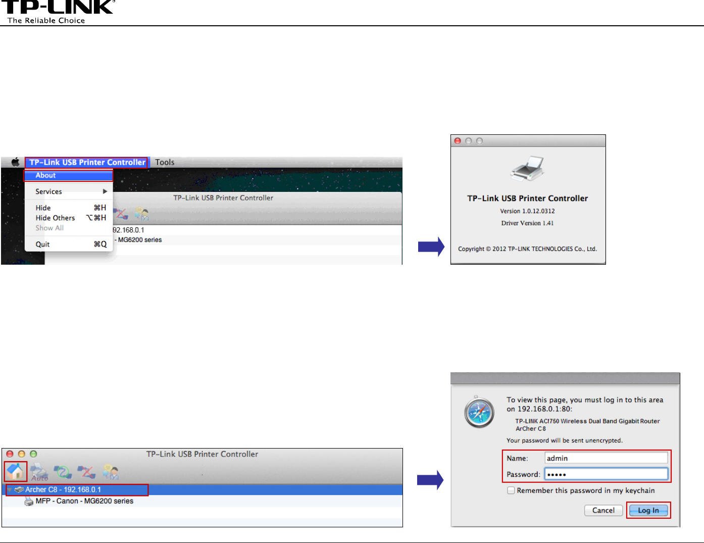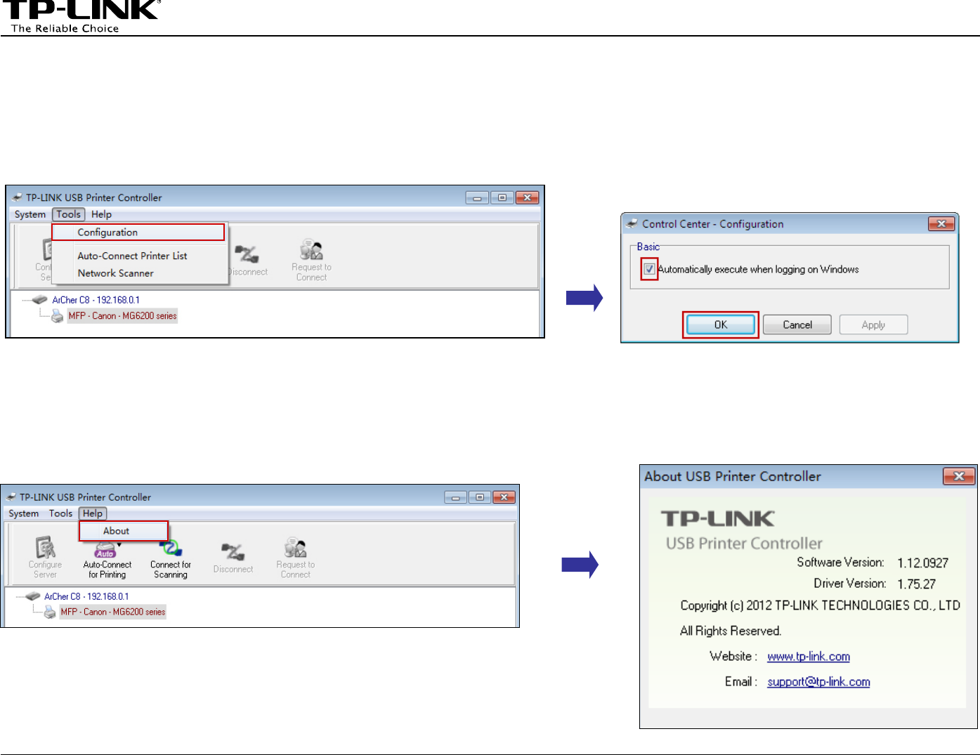 Go to TP-Link USB Printer Controller -> About; a window will pop up and display some relevant information