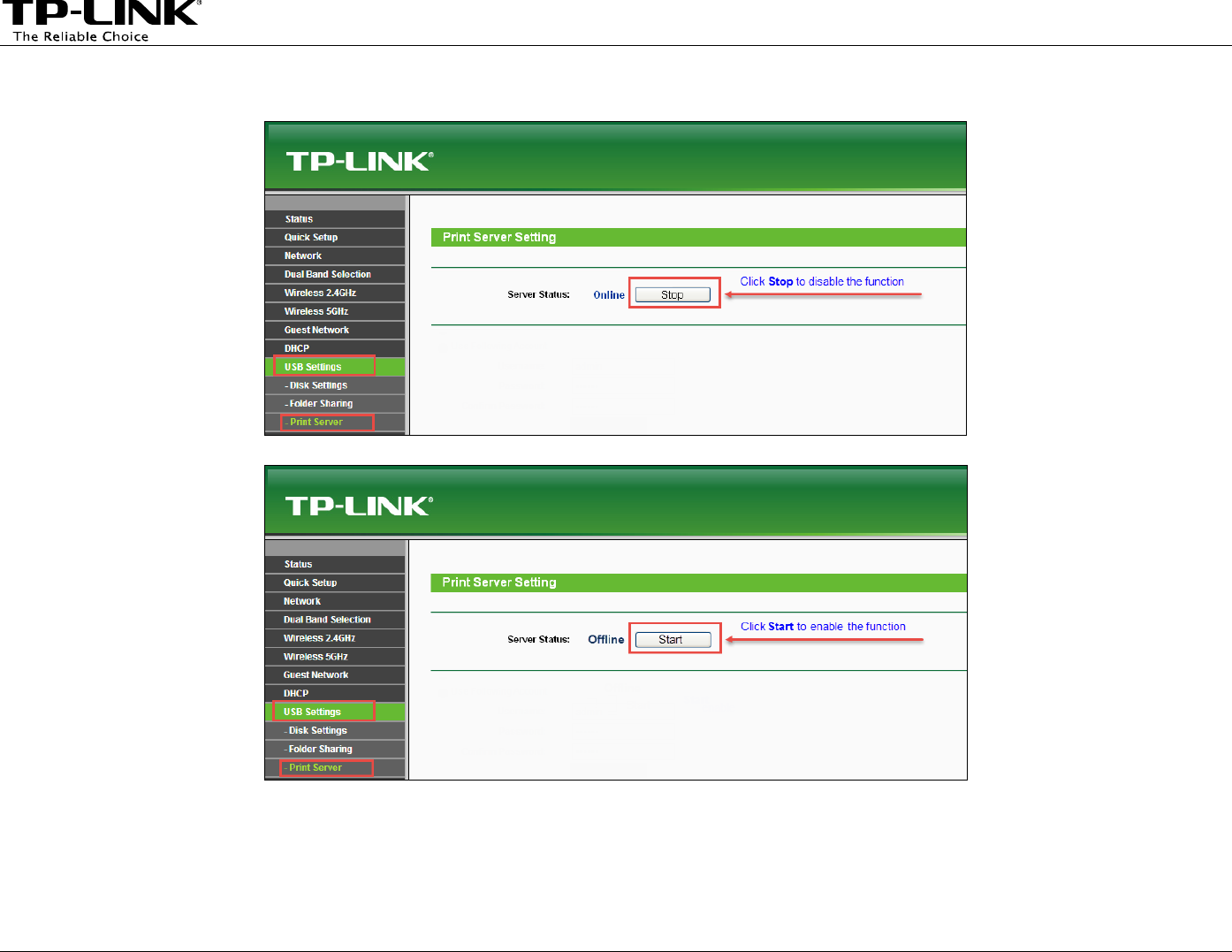 Print Server. Click Stop to disable the function. Click Start to enable the function.
