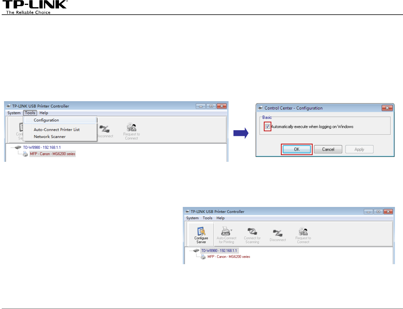 Per eseguire TP-LINK USB Printer Controller automaticamente fare clic su Tools (Strumenti) > Configuration (Configurazione)