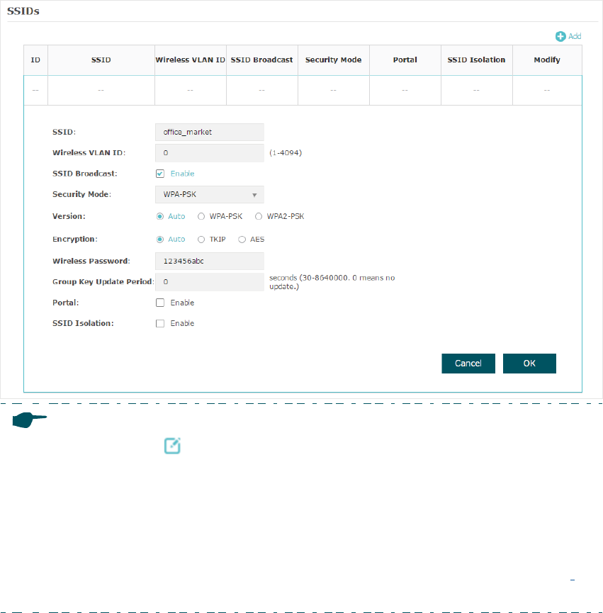 • You can click in the Modify column of the SSID entry to edit the SSID. For network