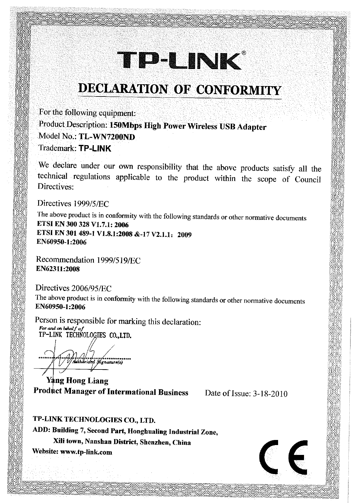 Tp Link Tl Wn7200Nd Declaration Of Conformity