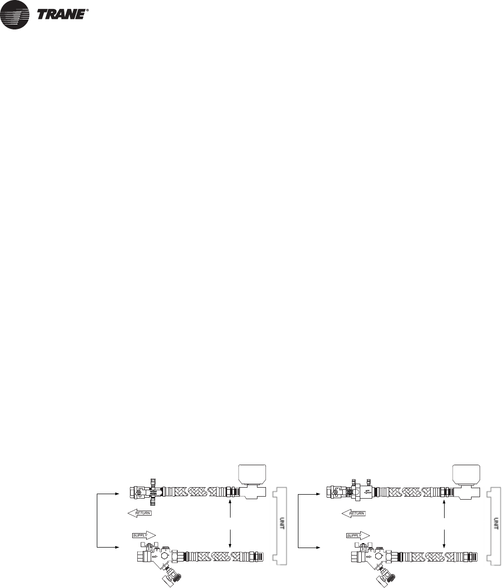 Ball valves are field installed between the unit and the supply and return lines of the loop to stop