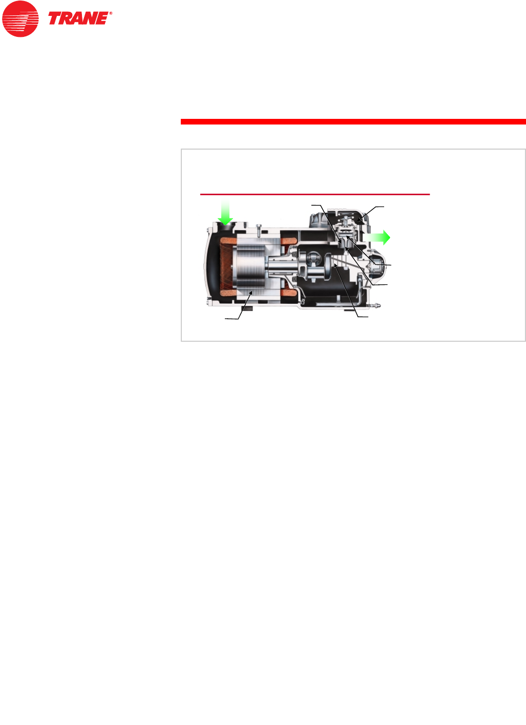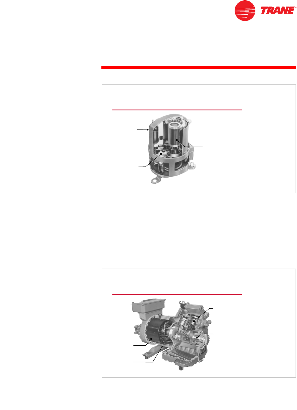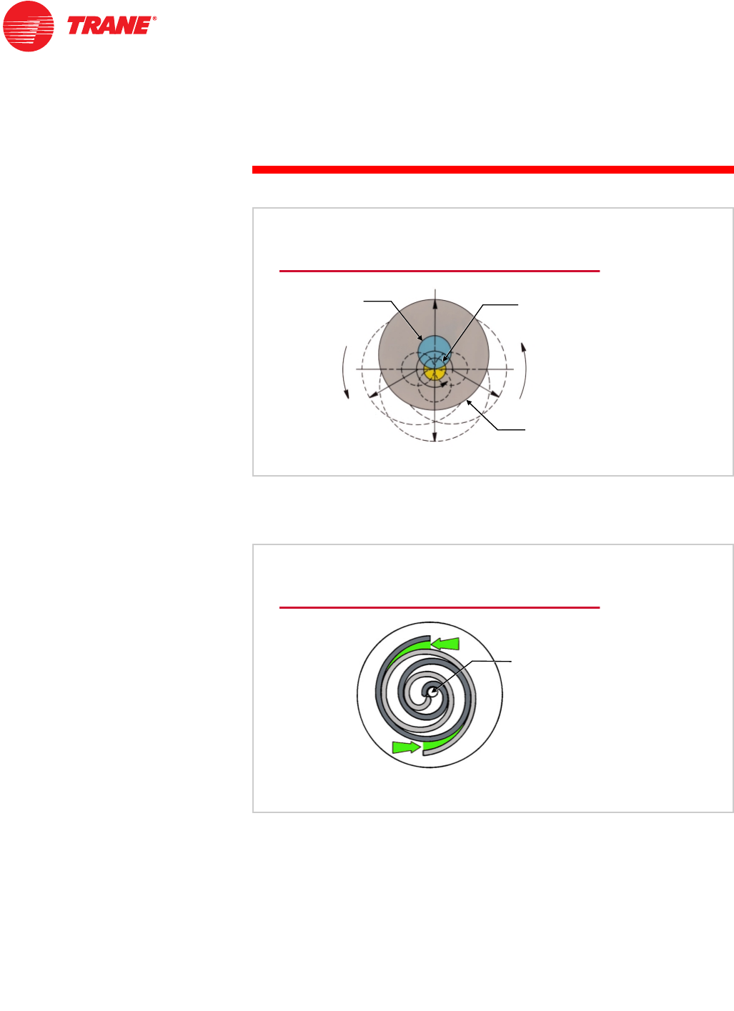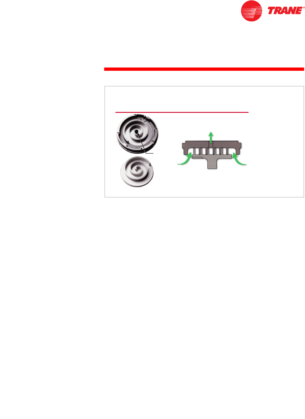 scroll compressor A type of compressor that uses two opposing scrolls to trap
