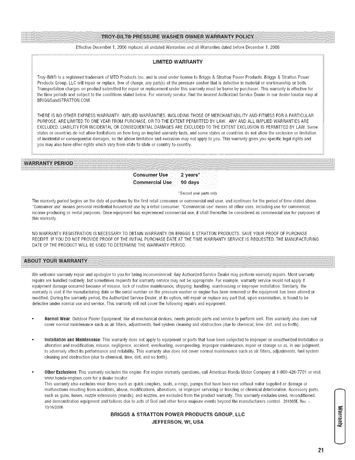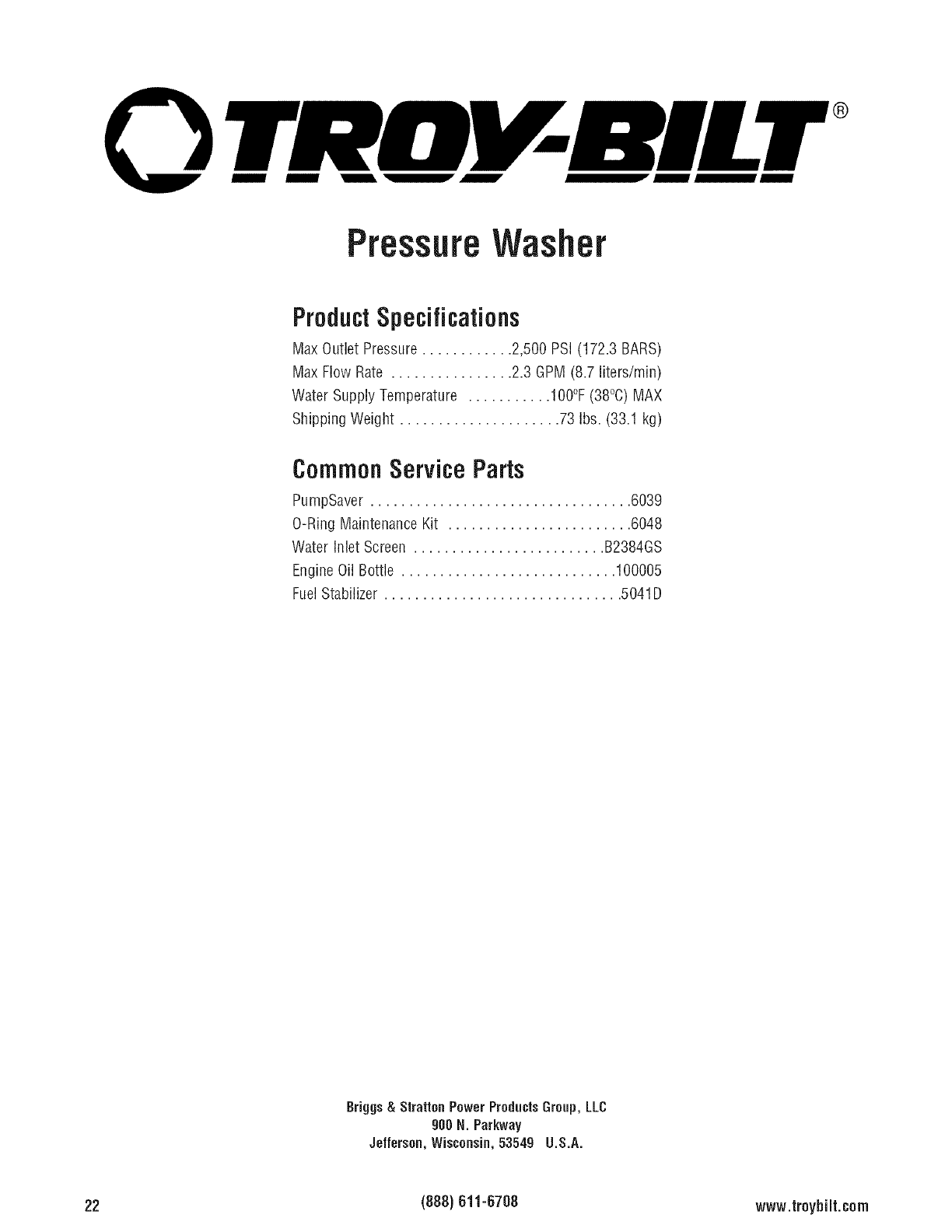 the Troy-Bilt brand. When operated and maintainedaccording to the instructions in this manual,your Troy-Bilt pressure